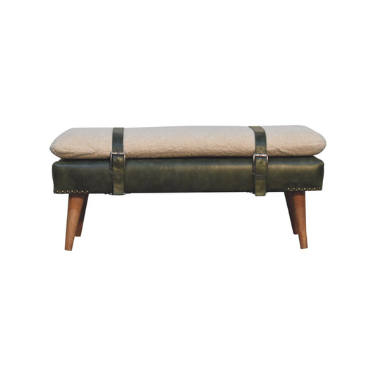Bouclé Buffalo Hide Olive Green Leather Bench