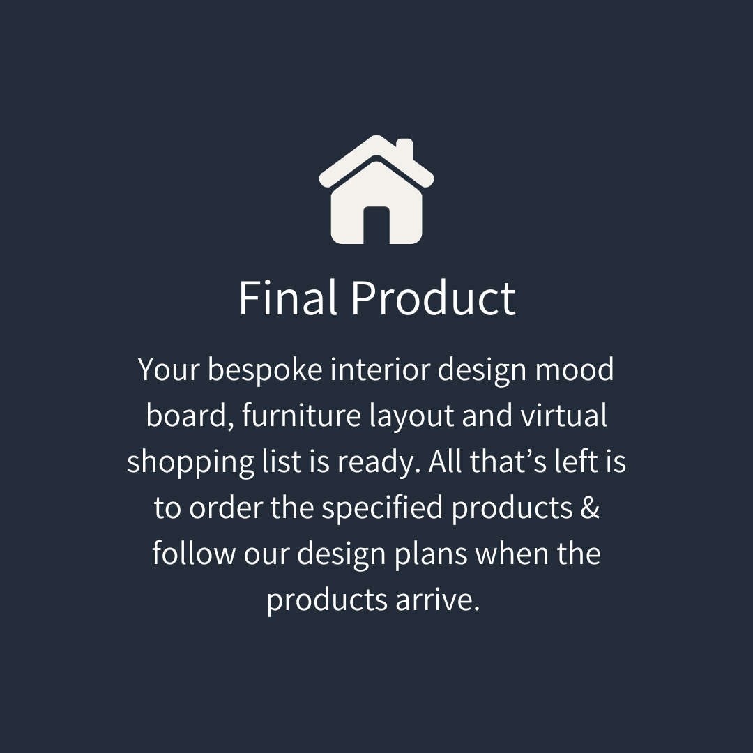 Included is a design questionnaire, virtual shopping list including links to all products, mood board and drawn up floor plans of the designed space.