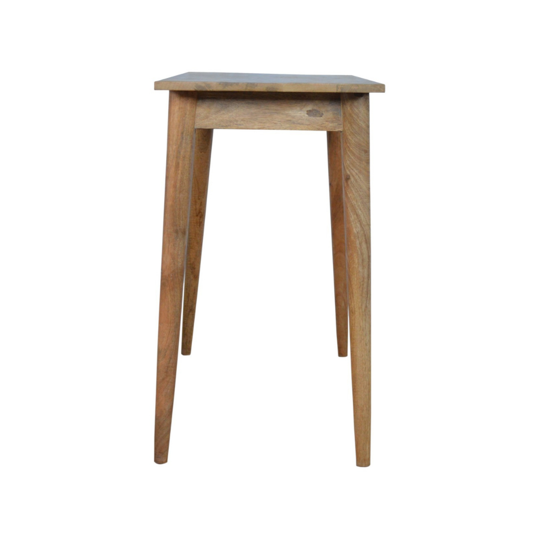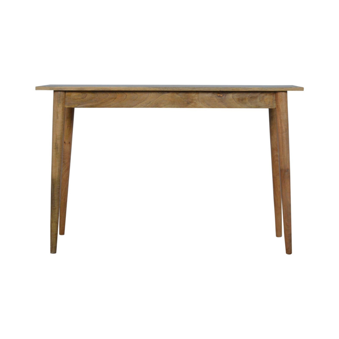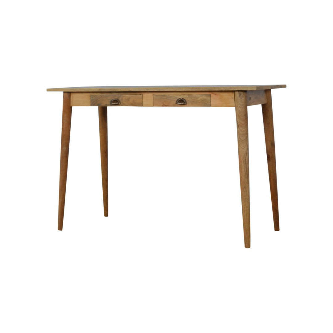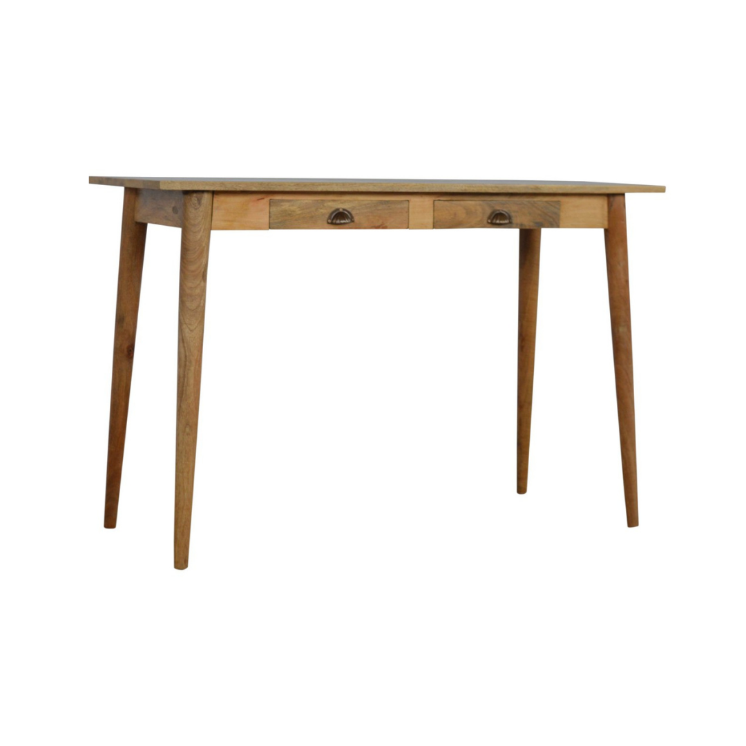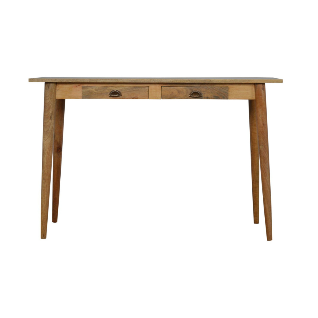 Elevate your workspace with our 2 Drawer Nordic Writing Desk. Crafted from 100% solid mango wood, this timeless piece boasts a sleek Nordic design and a smooth oak-ish finish. Featuring 4 Nordic style legs and 2 drawers with shell handles, it offers both style and functionality. Assemble with ease and enjoy the ample storage and spacious table top.