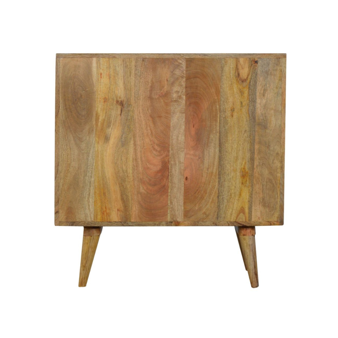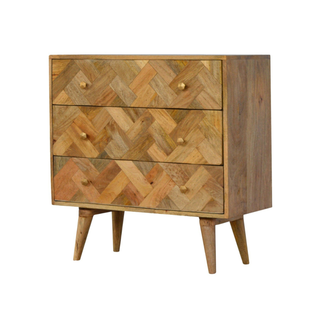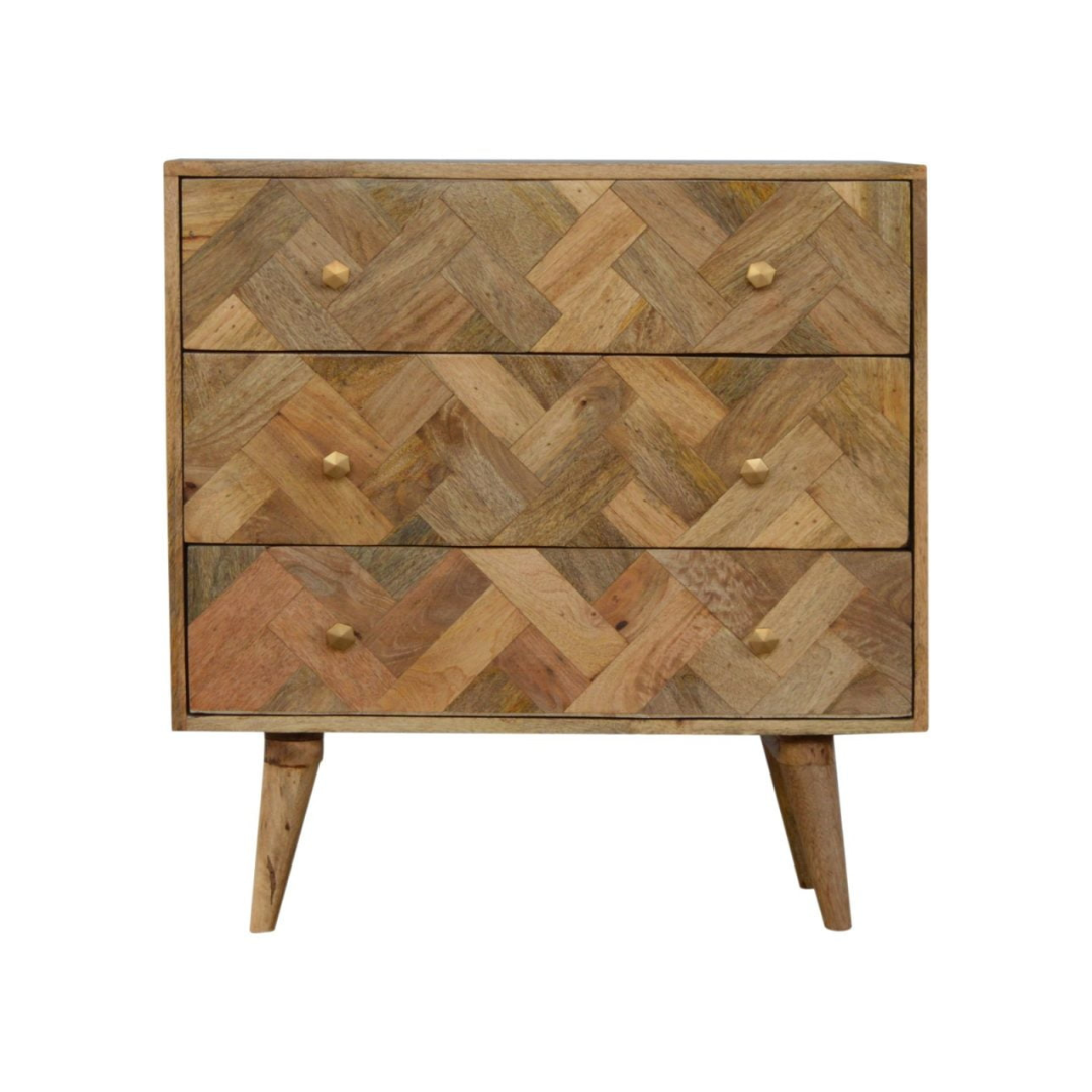 Introduce a touch of contemporary style to your home with our 3 Drawer Zig-Zag Patterned Patchwork Chest. Crafted from 100% solid mango wood and finished with a clear lacquer, this piece is not only durable but also adds a unique element to any room. With a striking zig-zag patchwork design and shiny brass hardware, this chest is both modern and functional.