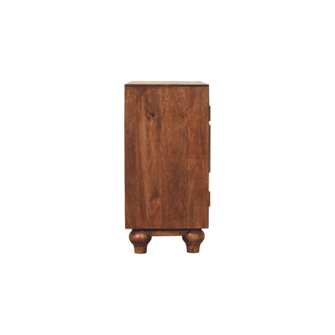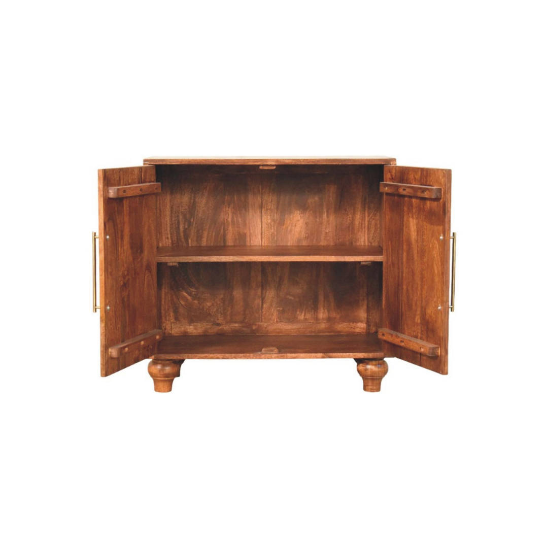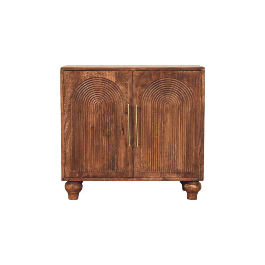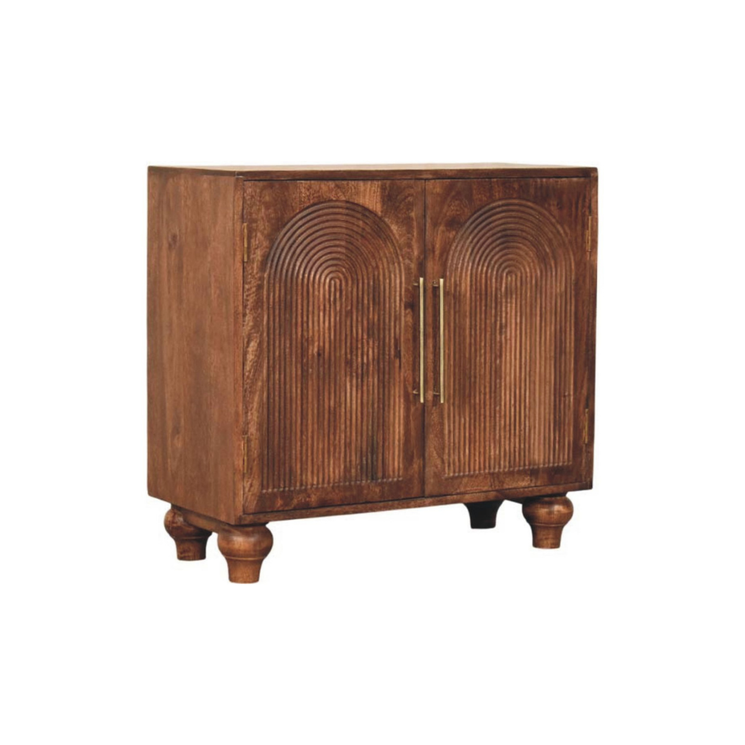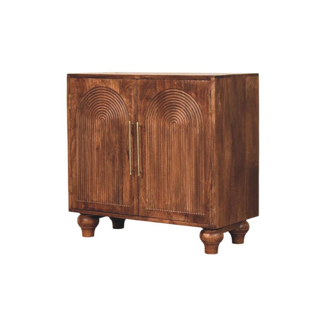 Crafted from 100% solid mango wood, the Arco Groove Sideboard combines artistic design with functional storage. Its hand-carved arc patterns on twin doors add dynamic texture, while the roasted almond finish enhances the wood’s natural grain. Elevated on rounded bun feet and detailed with brass handles, this sideboard brings warmth and elegance to any room. Perfect for organising essentials or displaying decor, it suits both modern and transitional interiors with timeless appeal.