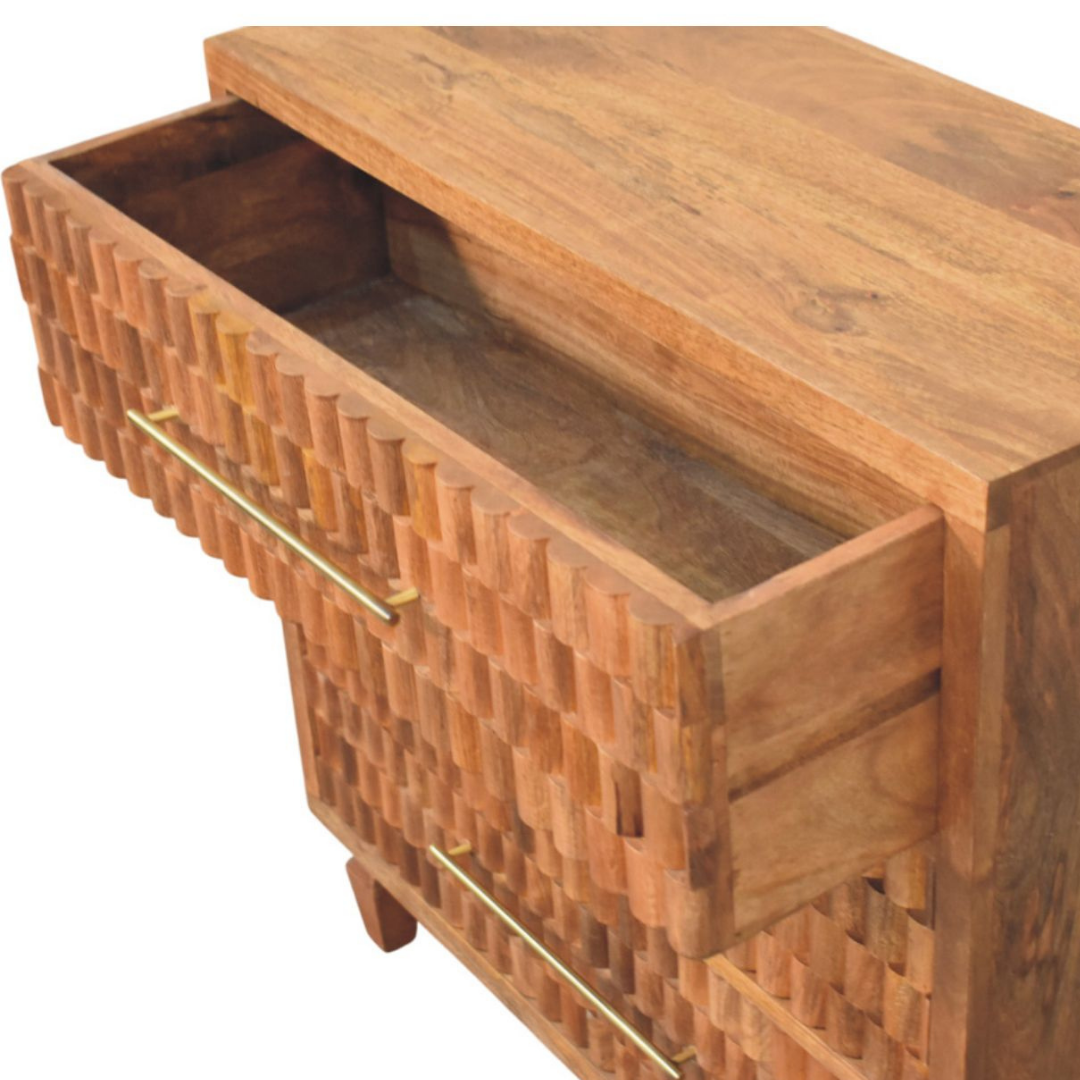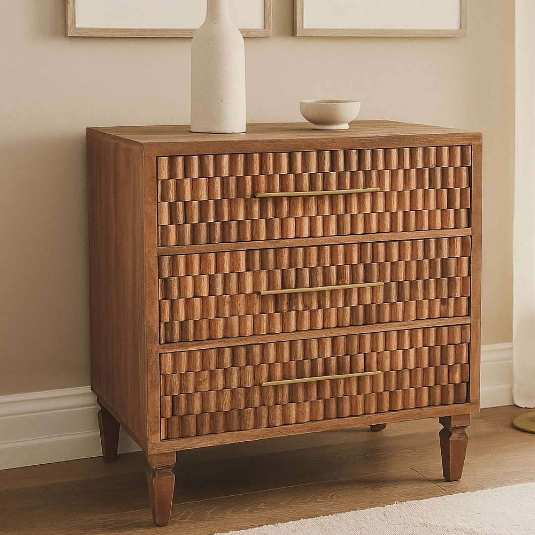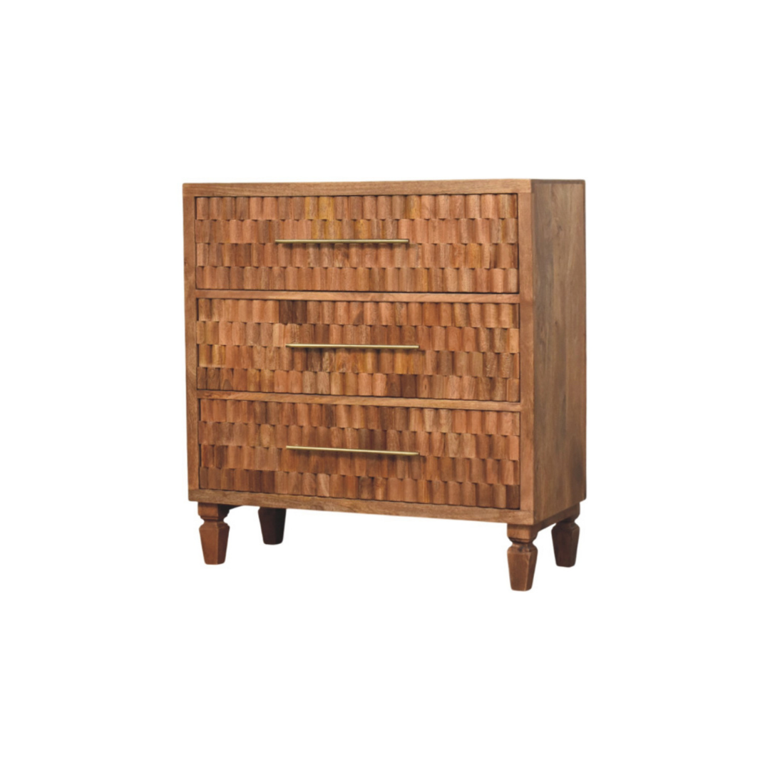 The Arno Chest in Golden Teak showcases the natural beauty of solid mango wood with a meticulously block-carved façade that highlights its rich grain and texture. Featuring slender antique brass handles, this piece combines artisanal craftsmanship with functional design, adding depth and refined warmth to bedrooms, entryways, or living areas. Its sculptural presence makes it a sophisticated statement that enhances any interior with elegance and organic character.