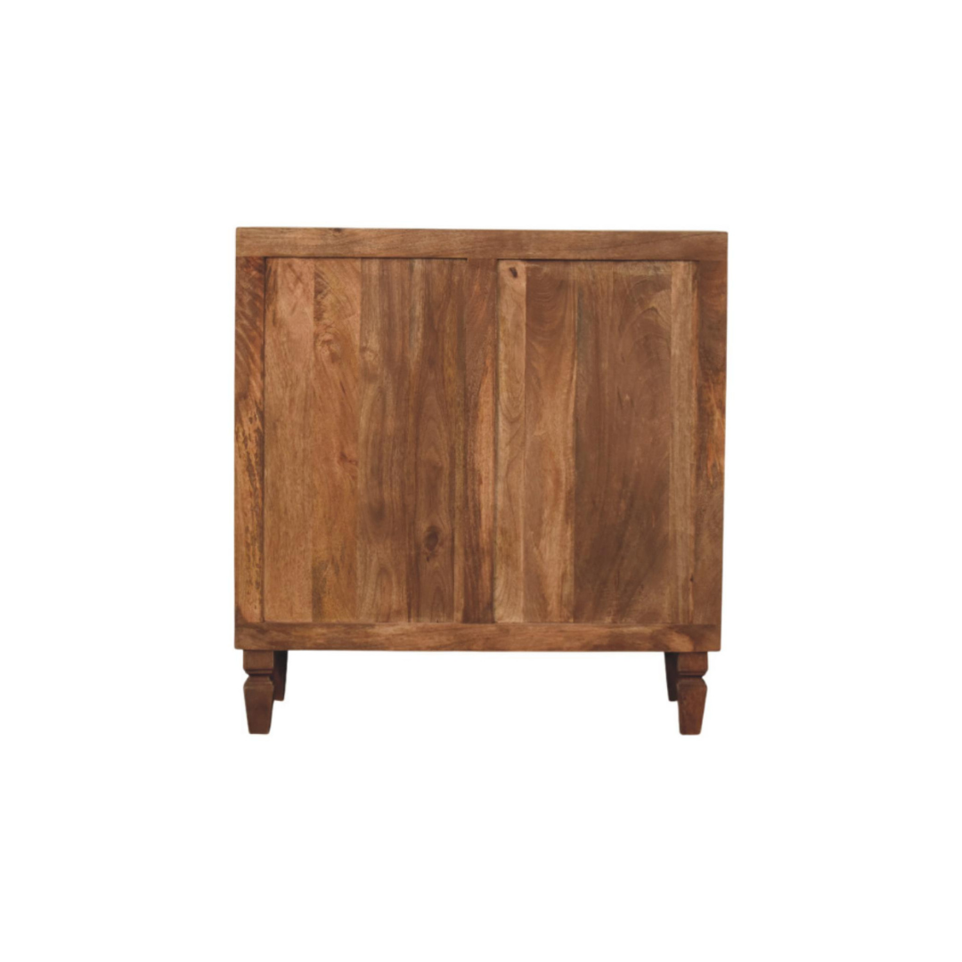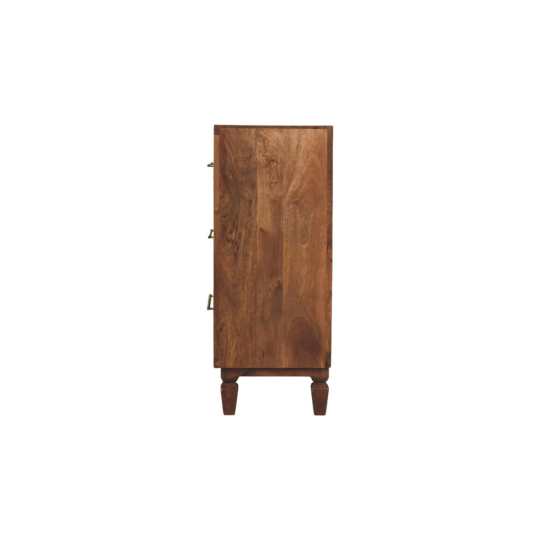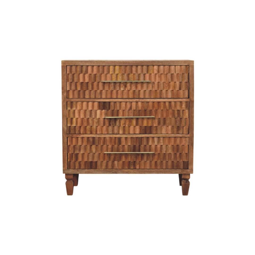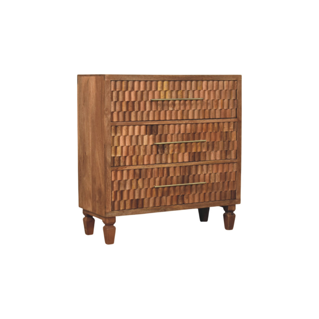 The Arno Chest in Golden Teak showcases the natural beauty of solid mango wood with a meticulously block-carved façade that highlights its rich grain and texture. Featuring slender antique brass handles, this piece combines artisanal craftsmanship with functional design, adding depth and refined warmth to bedrooms, entryways, or living areas. Its sculptural presence makes it a sophisticated statement that enhances any interior with elegance and organic character.