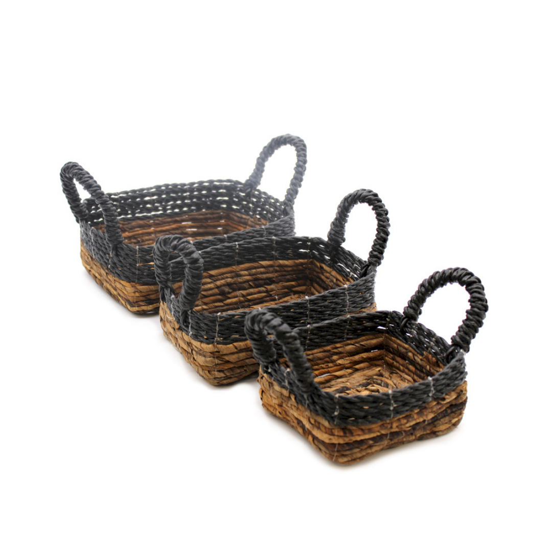These handcrafted square baskets are made from durable banana leaf and hitam raffia materials. The set of 3 offers a stylish and eco-friendly storage solution for your home. Each basket is unique and adds a touch of natural elegance to any room.