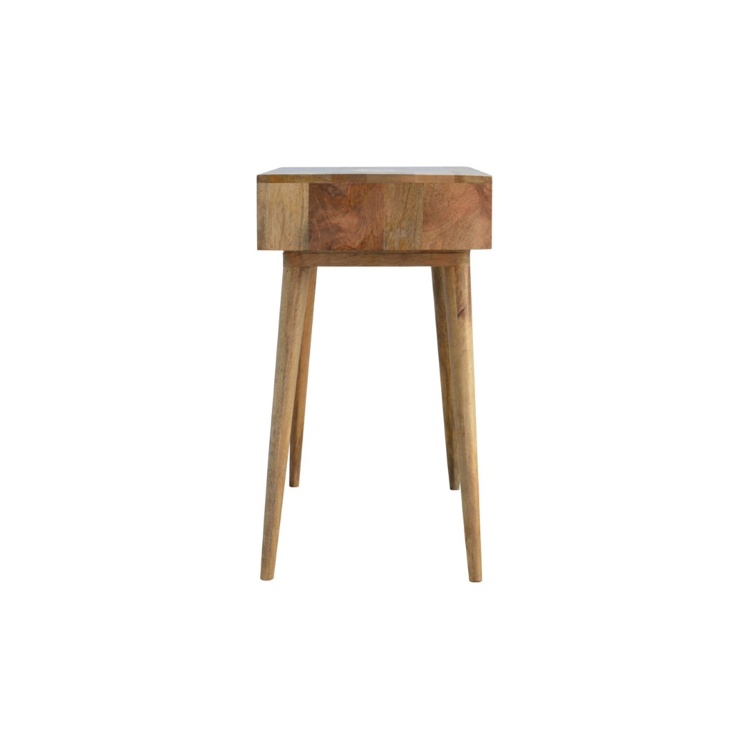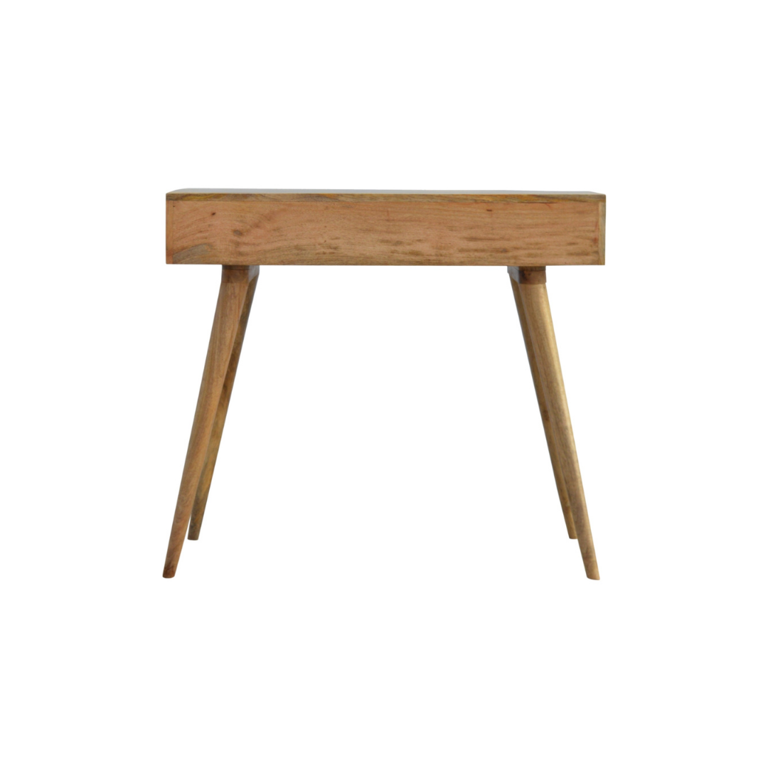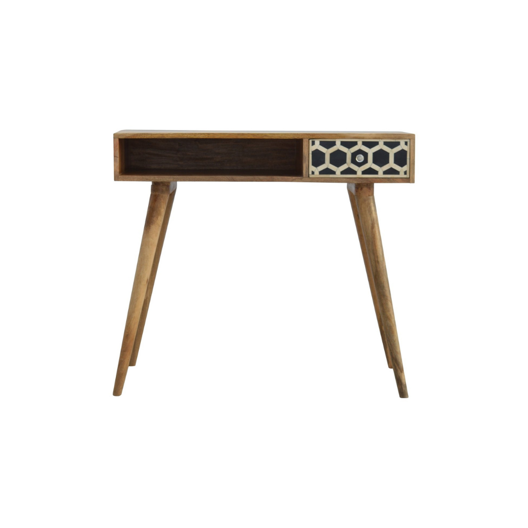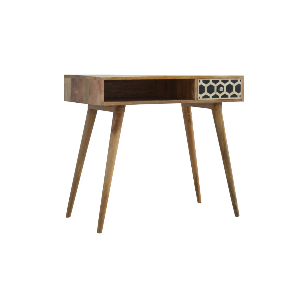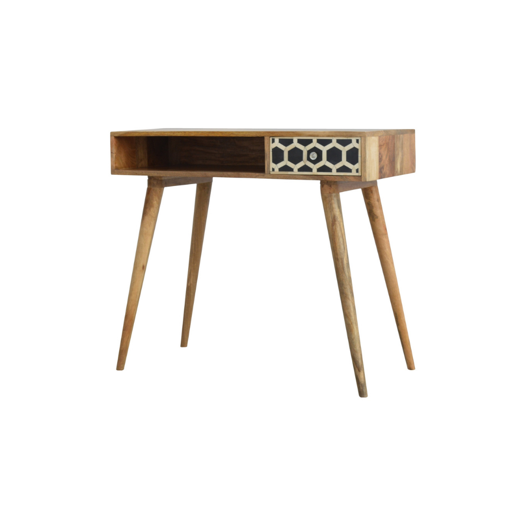 This Bone Inlay Writing Desk combines vintage charm with modern functionality. Crafted from 100% solid mango wood, it features a refined oak-like finish that enhances its natural beauty. The desk offers generous workspace, complemented by a bone inlay front drawer for secure storage and an open shelf for easy access to essentials. Supported by sleek Nordic-style legs, this piece brings both elegance and durability to your workspace, making it ideal for focused productivity and timeless style.