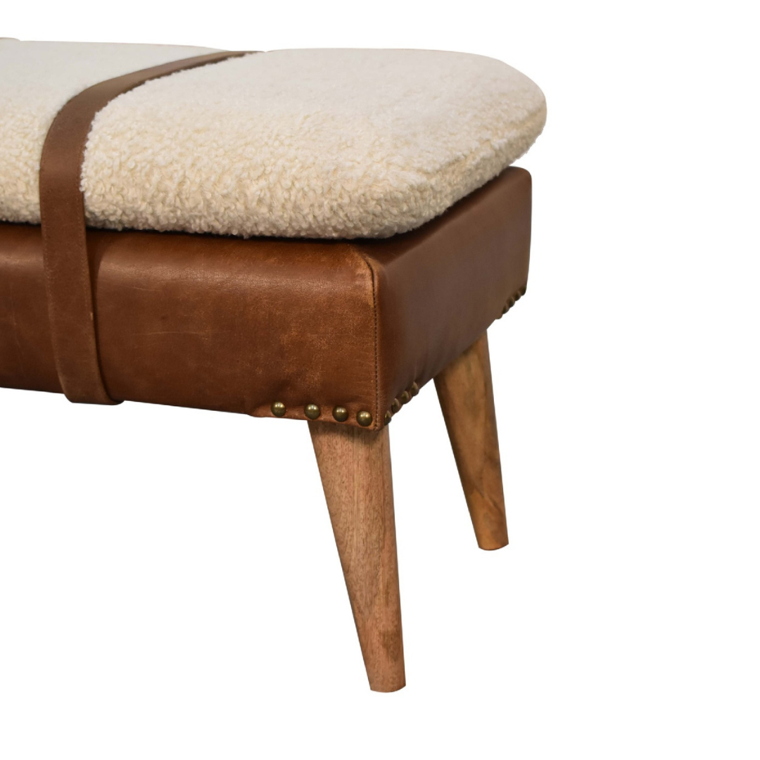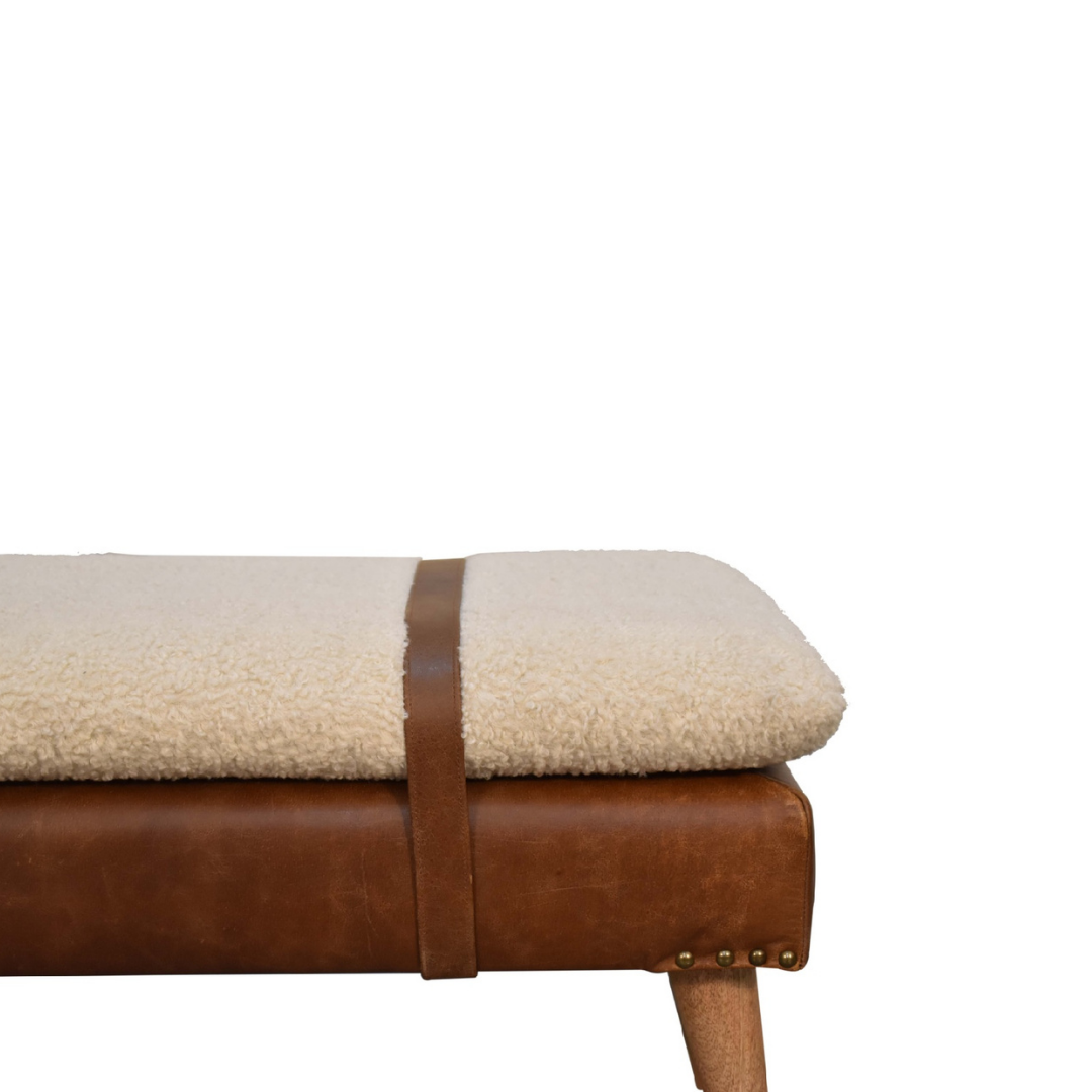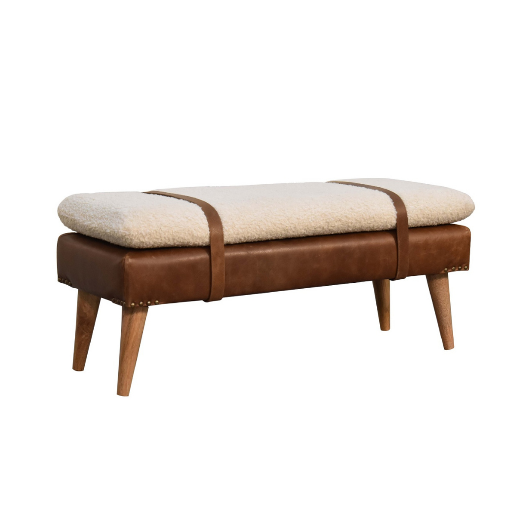 Expertly crafted and visually stunning, the Bouclé Buffalo Hide Leather Bench is a fusion of 100% cotton, natural yarn, and buffalo hide leather. The belted strap design and solid wood legs with an oak-ish finish add strength and durability to this handwoven upholstered furniture piece.