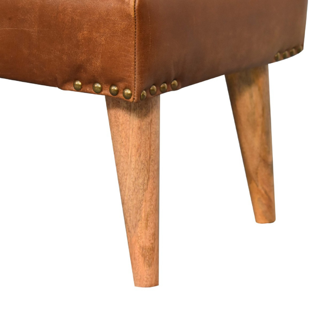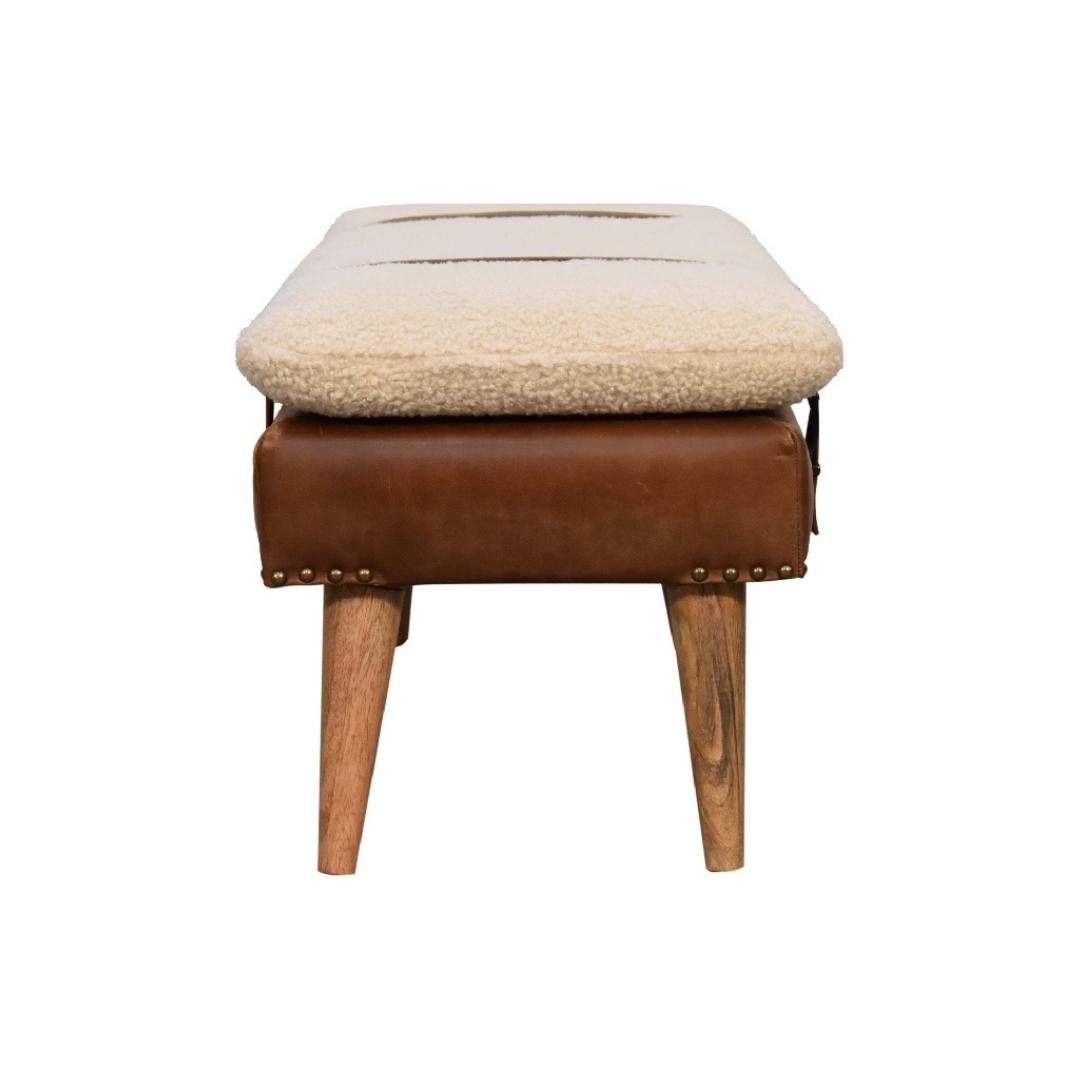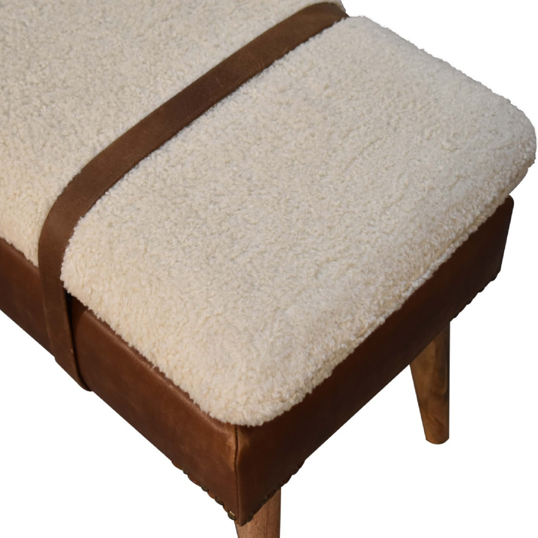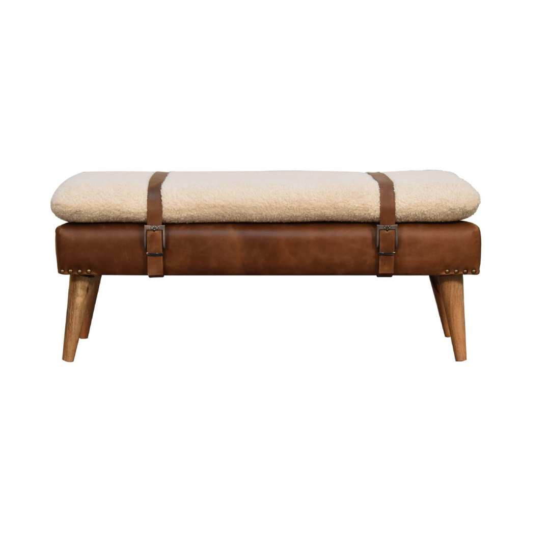 Expertly crafted and visually stunning, the Bouclé Buffalo Hide Leather Bench is a fusion of 100% cotton, natural yarn, and buffalo hide leather. The belted strap design and solid wood legs with an oak-ish finish add strength and durability to this handwoven upholstered furniture piece.