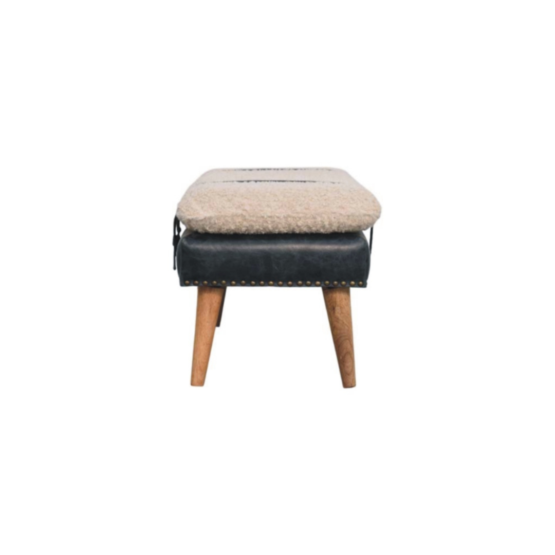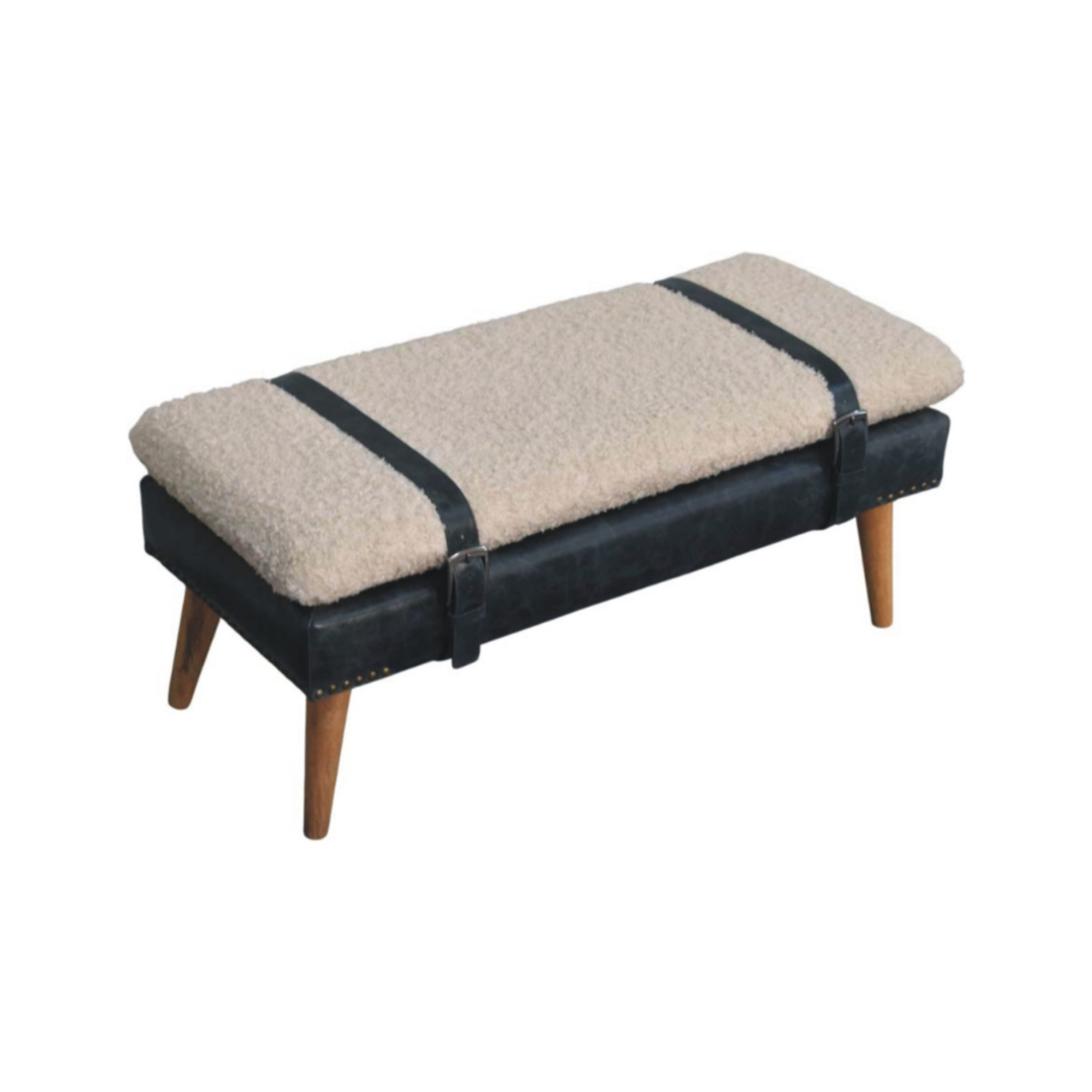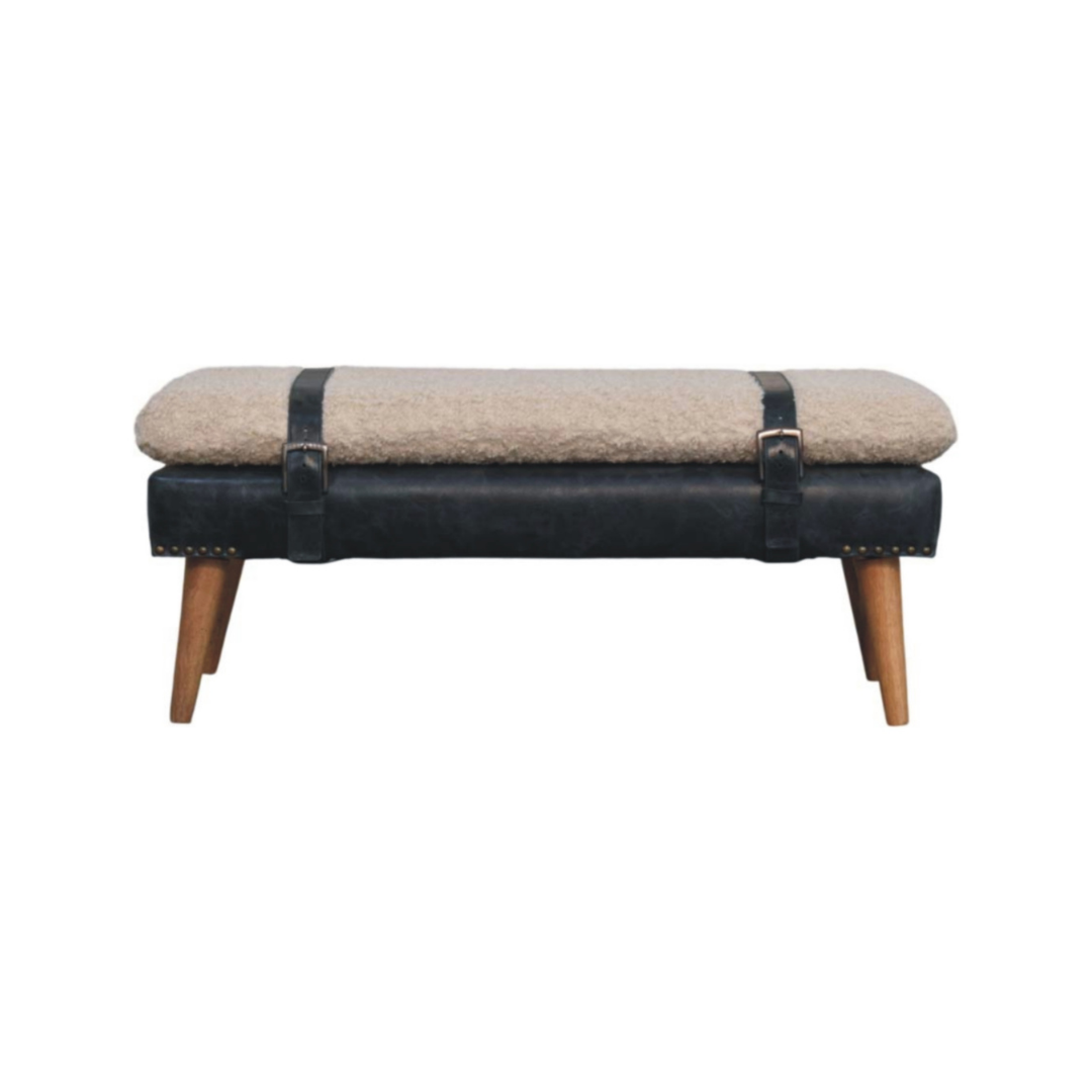 The Boucle x Black Leather Bench combines refined texture with timeless design. Upholstered in soft 100% cotton boucle and detailed with genuine Buffalo hide leather straps, it offers both comfort and visual interest. Supported by sturdy Nordic solid wood legs in a classic oak finish, this bench ensures lasting durability. Ideal for entryways, bedrooms, or living areas, it adds a sophisticated and warm touch to any space.