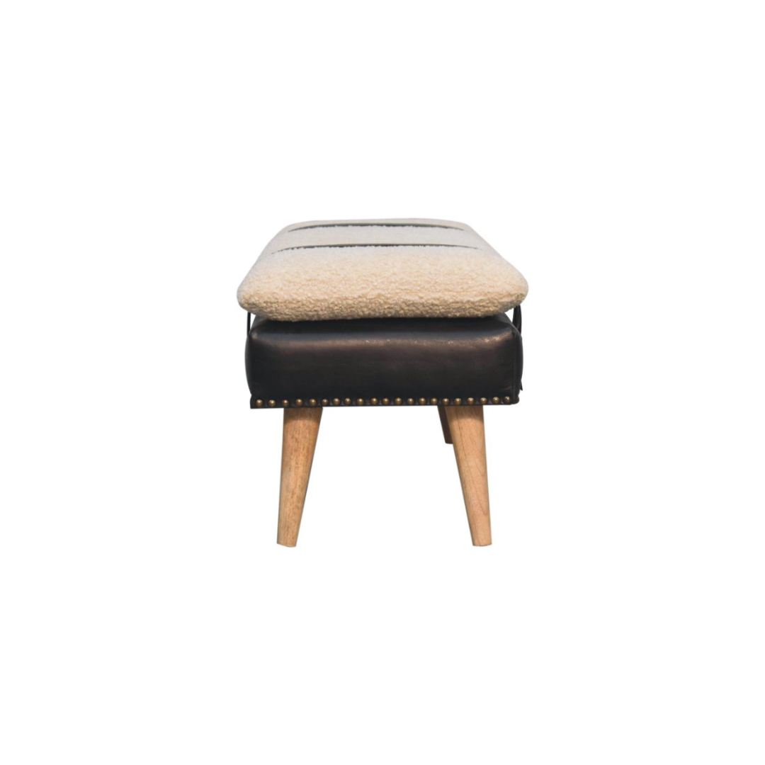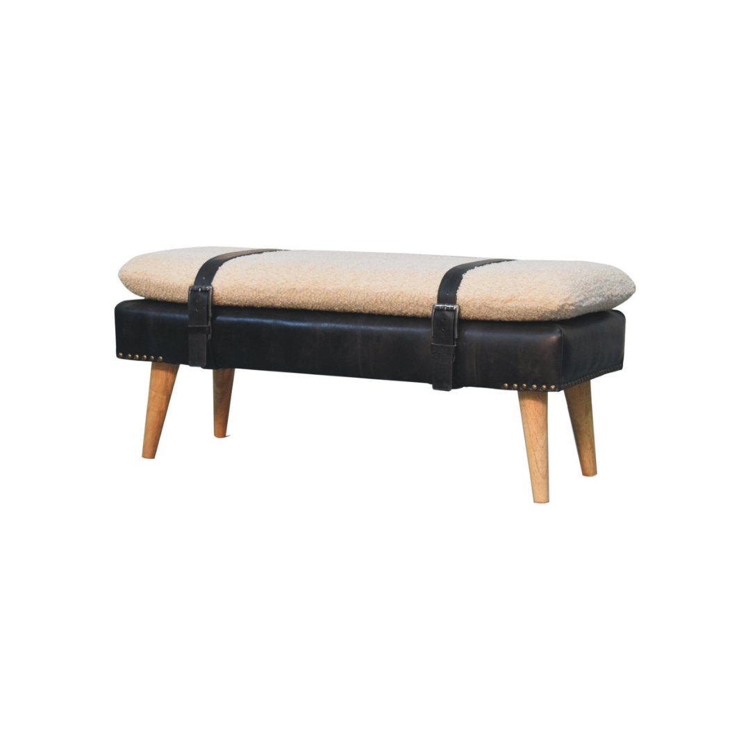 This Bouclé Buffalo Hide Black Leather Bench combines luxurious texture with durable craftsmanship. Featuring supple buffalo hide leather in a rich black finish, it offers both comfort and resilience. The bouclé upholstery adds a sophisticated tactile dimension, making it an elegant addition to any living space or entryway. Its sturdy construction ensures lasting support, while the sleek design complements modern and classic interiors alike. Ideal for seating or as a stylish accent piece, this bench balances refined aesthetics with practical functionality.