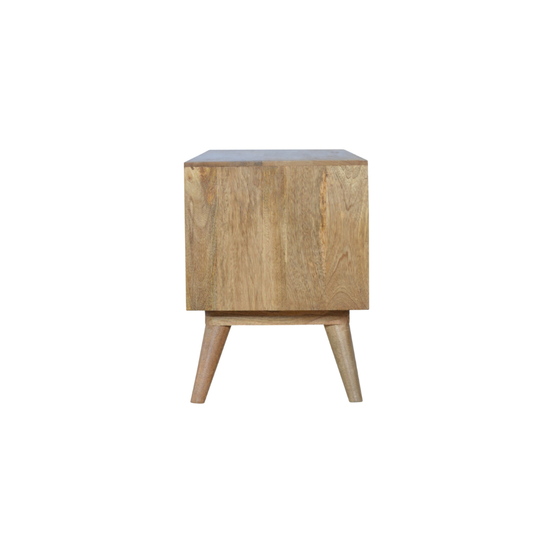 This Grey Painted Open TV Unit combines Nordic simplicity with modern elegance, crafted from 100% solid mango wood for durability and a smooth oak-like finish. Featuring four spacious drawers hand-painted in two shades of grey, it offers ample concealed storage, while two open shelves provide space to showcase your favourite decor.