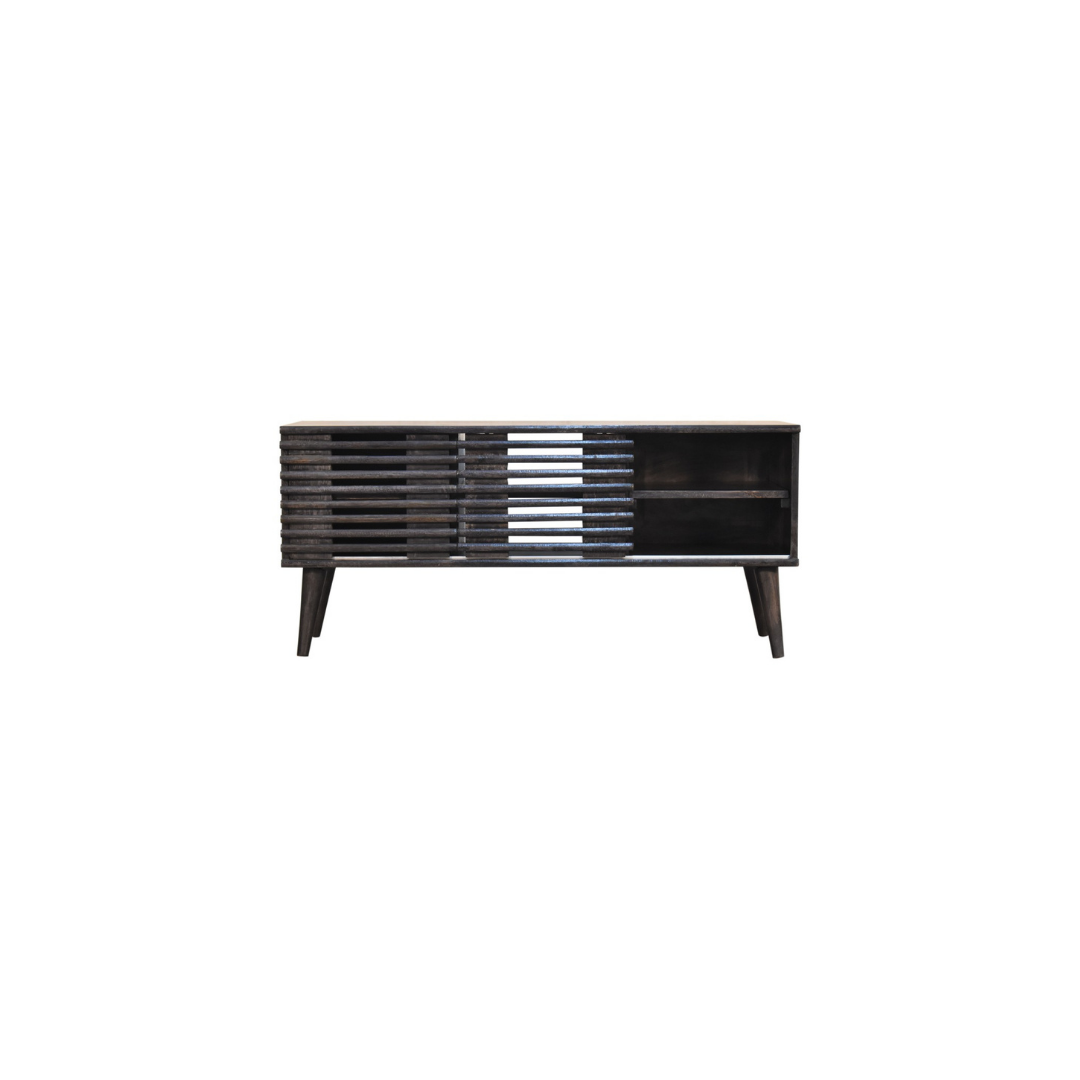 The Kobe Media Unit combines Mid-Century Modern and Scandinavian design, crafted from 100% solid mango wood with an ash black finish. Its ridged cabinet doors add texture and depth, while providing practical storage and display space for your TV, speakers, and gaming consoles. This elegant and functional piece enhances any living area with timeless style and durability.