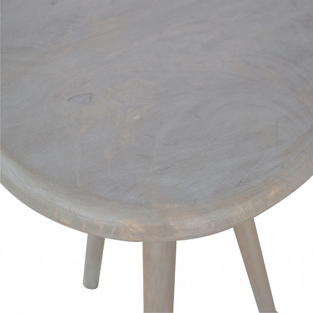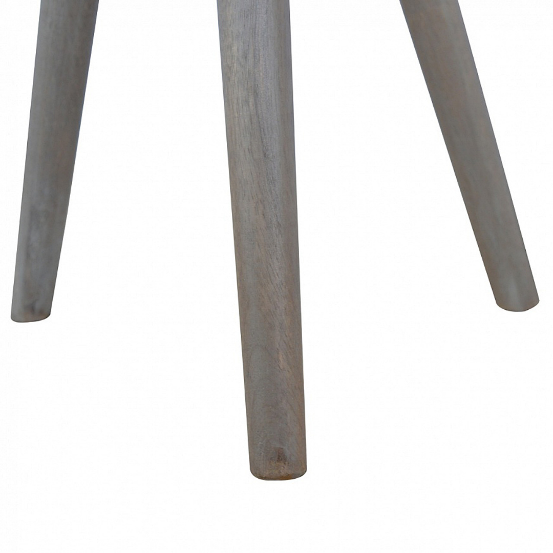 Crafted from 100% solid mango wood, the Lulu Round Tripod End Table features a distinctive hexagon-shaped top with a refined washed grey finish. Its four Scandinavian-style legs provide sturdy support while adding a minimalist, elegant touch. This table combines durability with timeless design, making it a versatile addition to any living space.