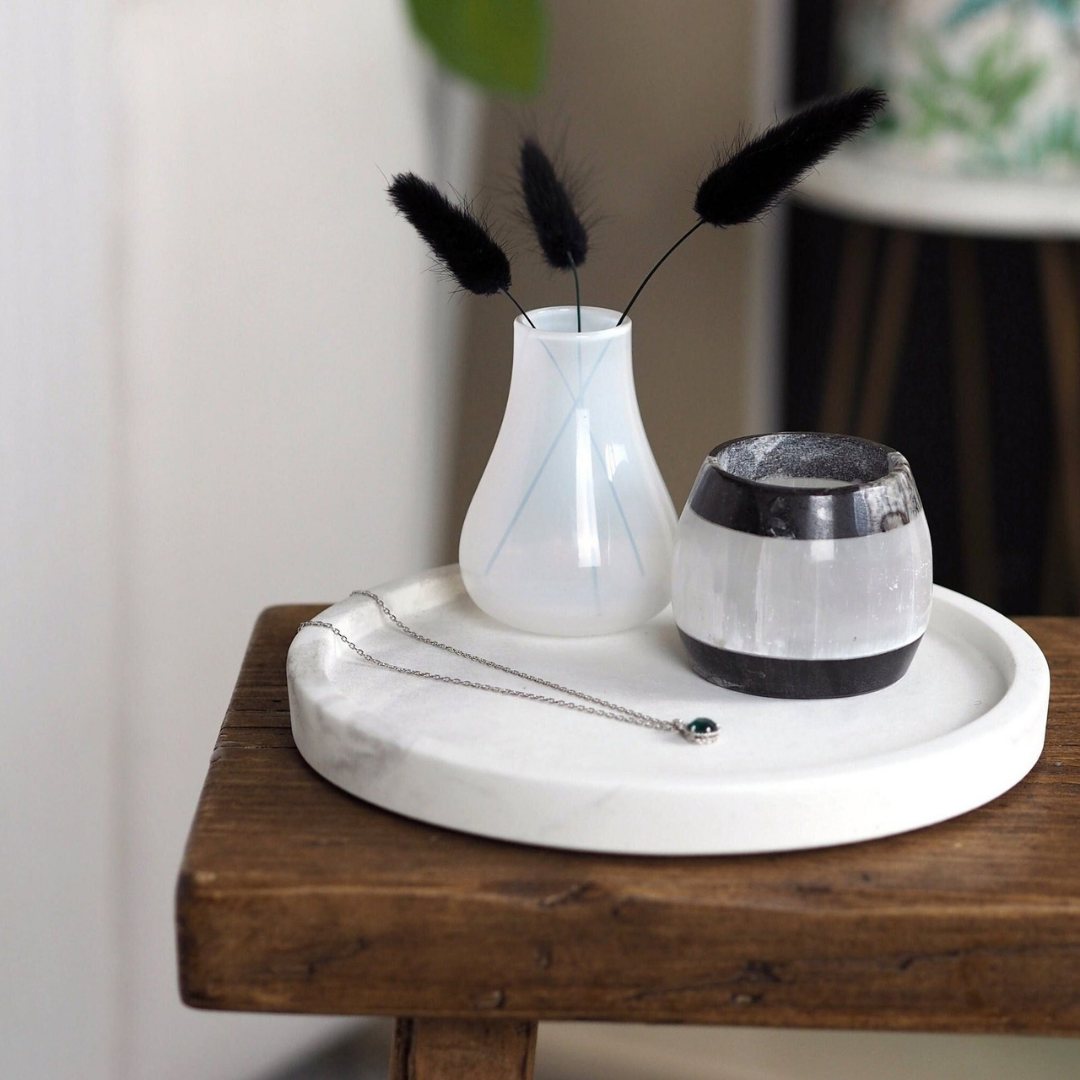 Expertly crafted, this medium white marble concrete round display tray showcases a sophisticated design that adds elegance to any space. Made of high-quality materials, it is durable and versatile. Perfect for organising and displaying items, it offers a sleek and modern touch to your home decor.
