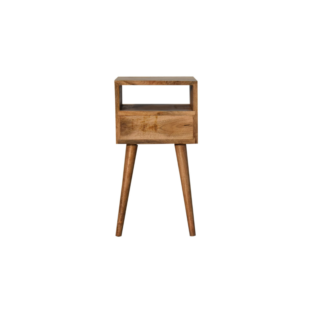 Expertly crafted from high-quality, 100% solid mango wood with a sleek oak-ish finish, the Mini Sky Blue Hand Painted Bedside offers both style and functionality. Its 1 navy hand-painted drawer, 1 shelf, and spacious tabletop provide ample storage and display space. The modern, Scandinavian-inspired design will elevate any room's decor.