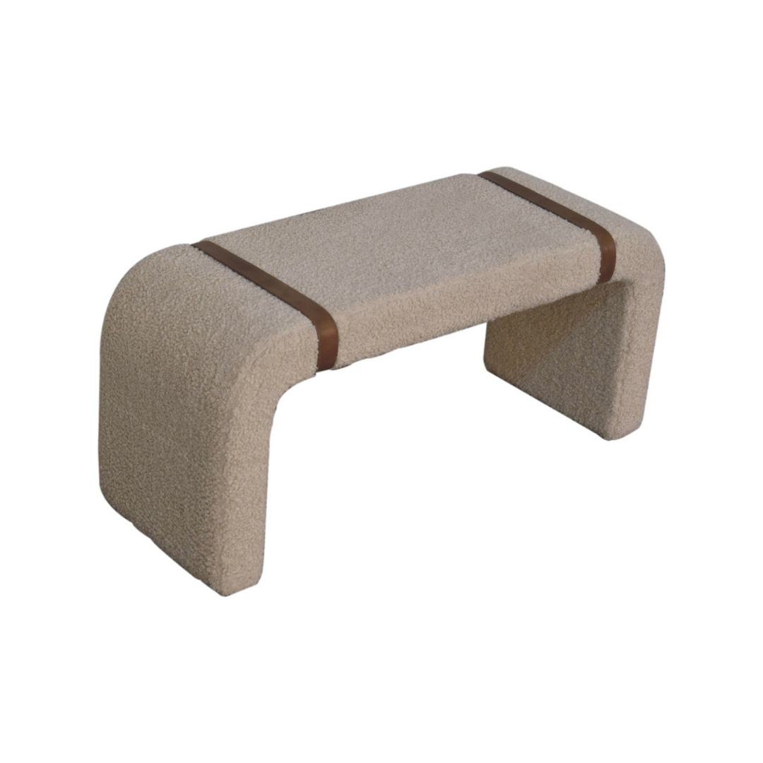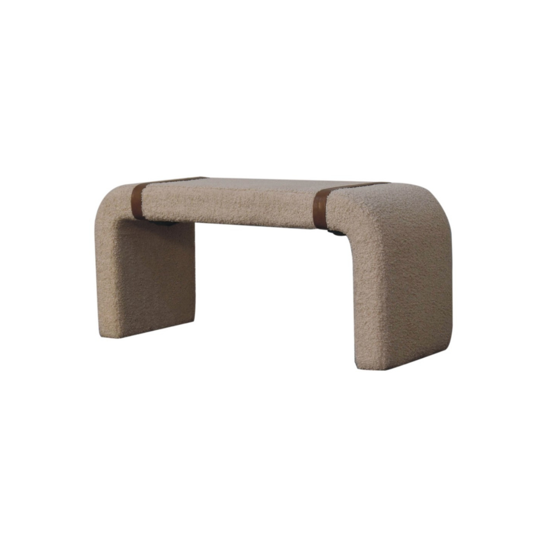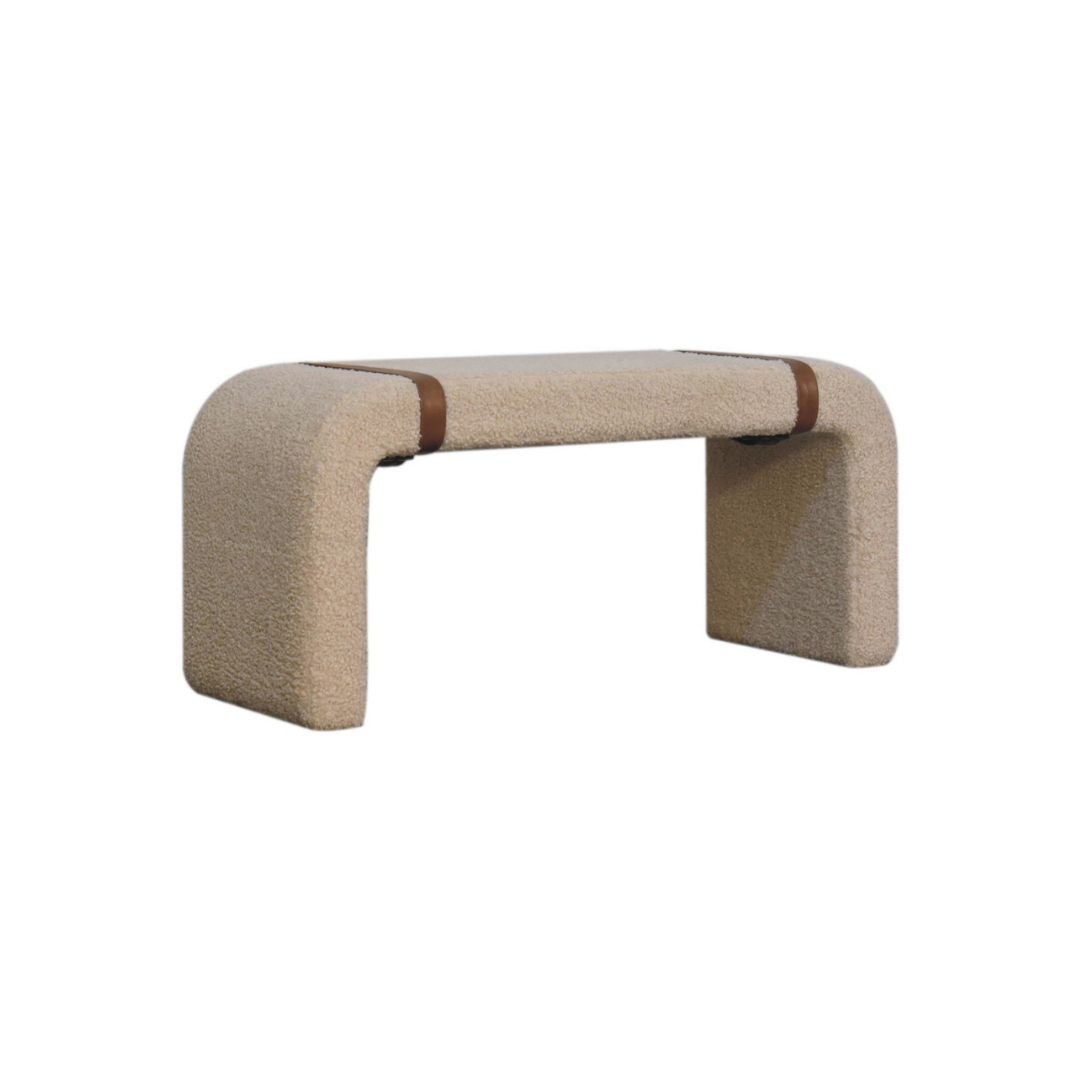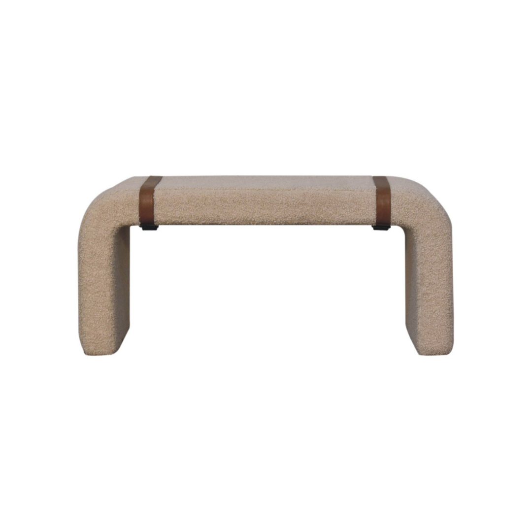 The Boucle Leather Strap Bench features a contemporary curved silhouette paired with a plush, cushioned top for superior comfort. Its distinctive belted strap detailing on both sides adds a refined touch, making it an elegant and functional addition to hallways, reception areas, or living rooms. Crafted to blend style with practicality, this bench enhances any space with subtle sophistication.