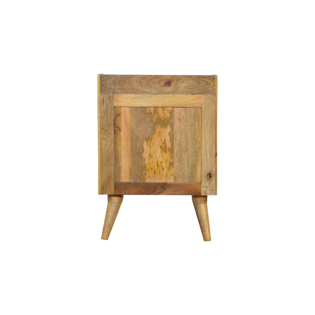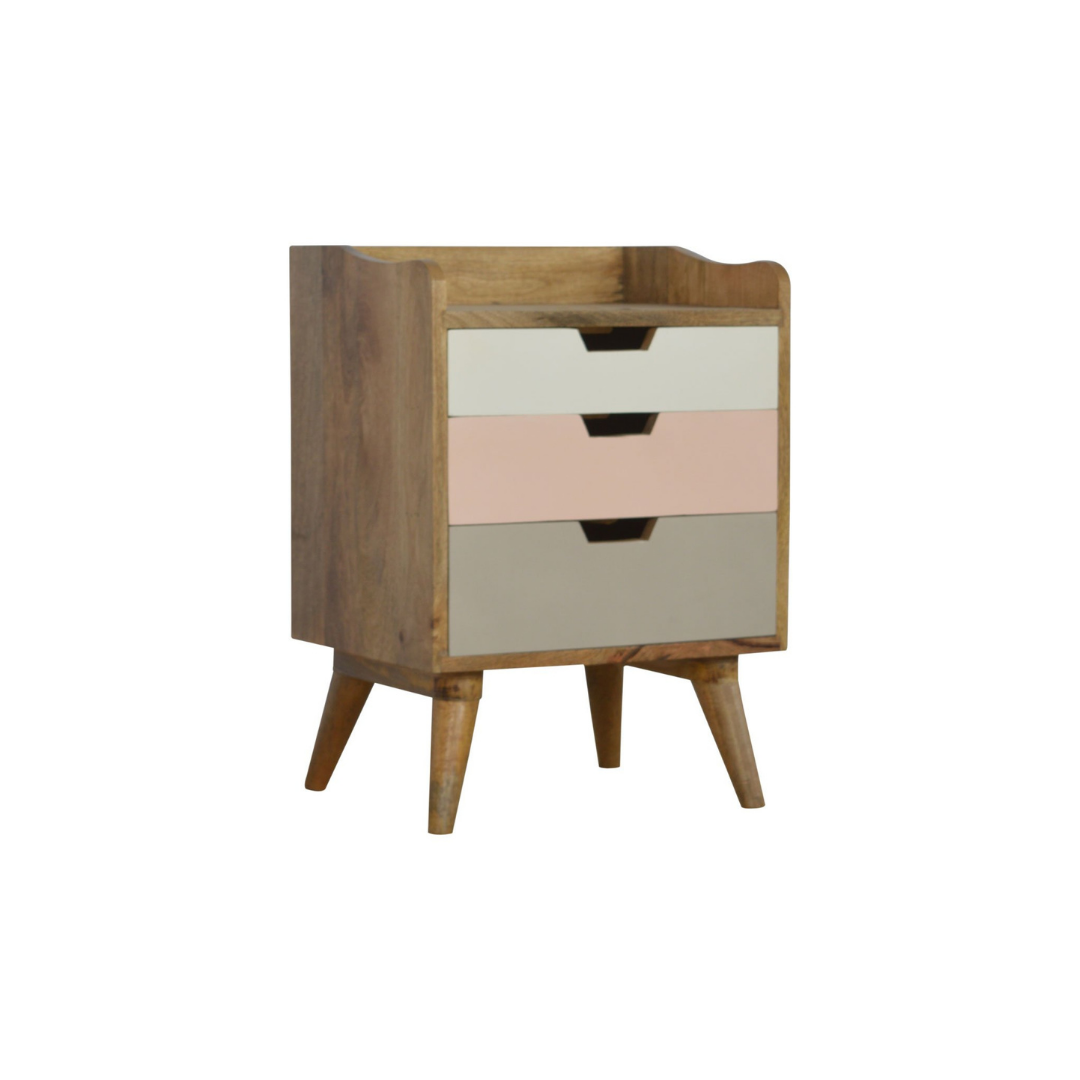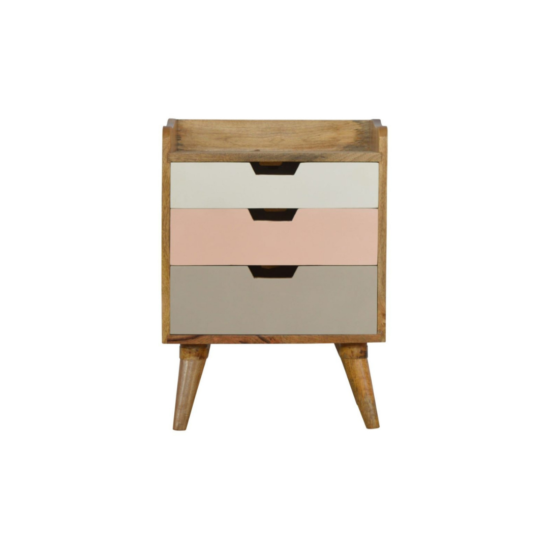 This Pink Painted Bedside Table, crafted from 100% solid mango wood, features a sun bleach finish body complemented by three pink hand-painted drawer fronts. Designed with Nordic simplicity, it provides ample space to hold a lamp, photo frame, or personal items, keeping essentials within easy reach. Its durable construction and refined finish make it a practical and stylish addition to any bedroom.