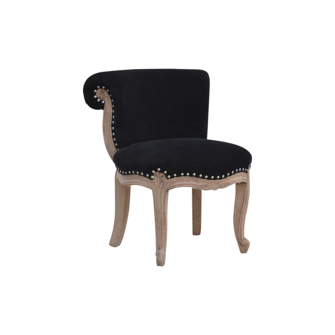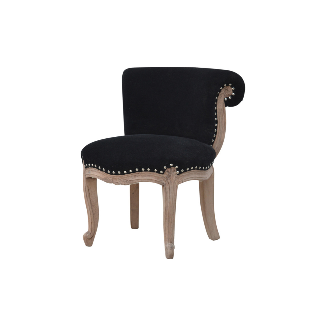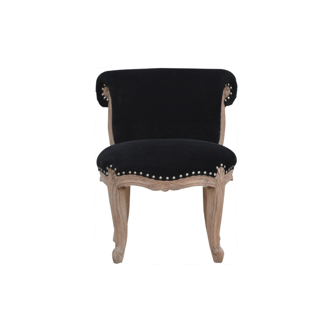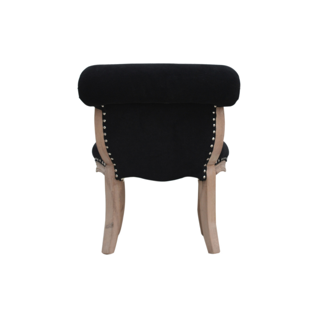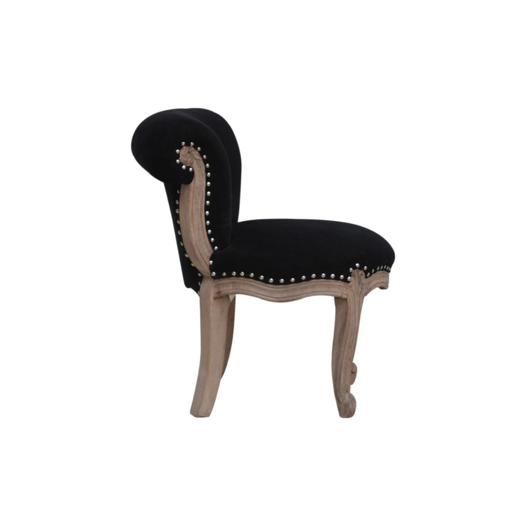 The Black Studded Chair elevates your space with its rich cotton velvet upholstery and distinctive studded detailing. This occasional chair combines luxurious texture with a chic design, making it a stylish and sophisticated addition to any home decor.