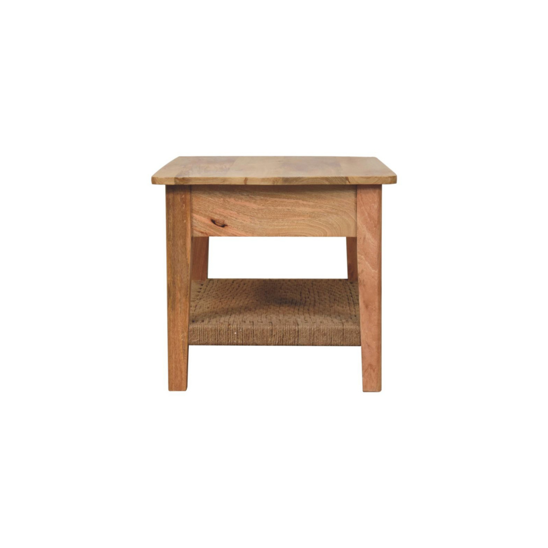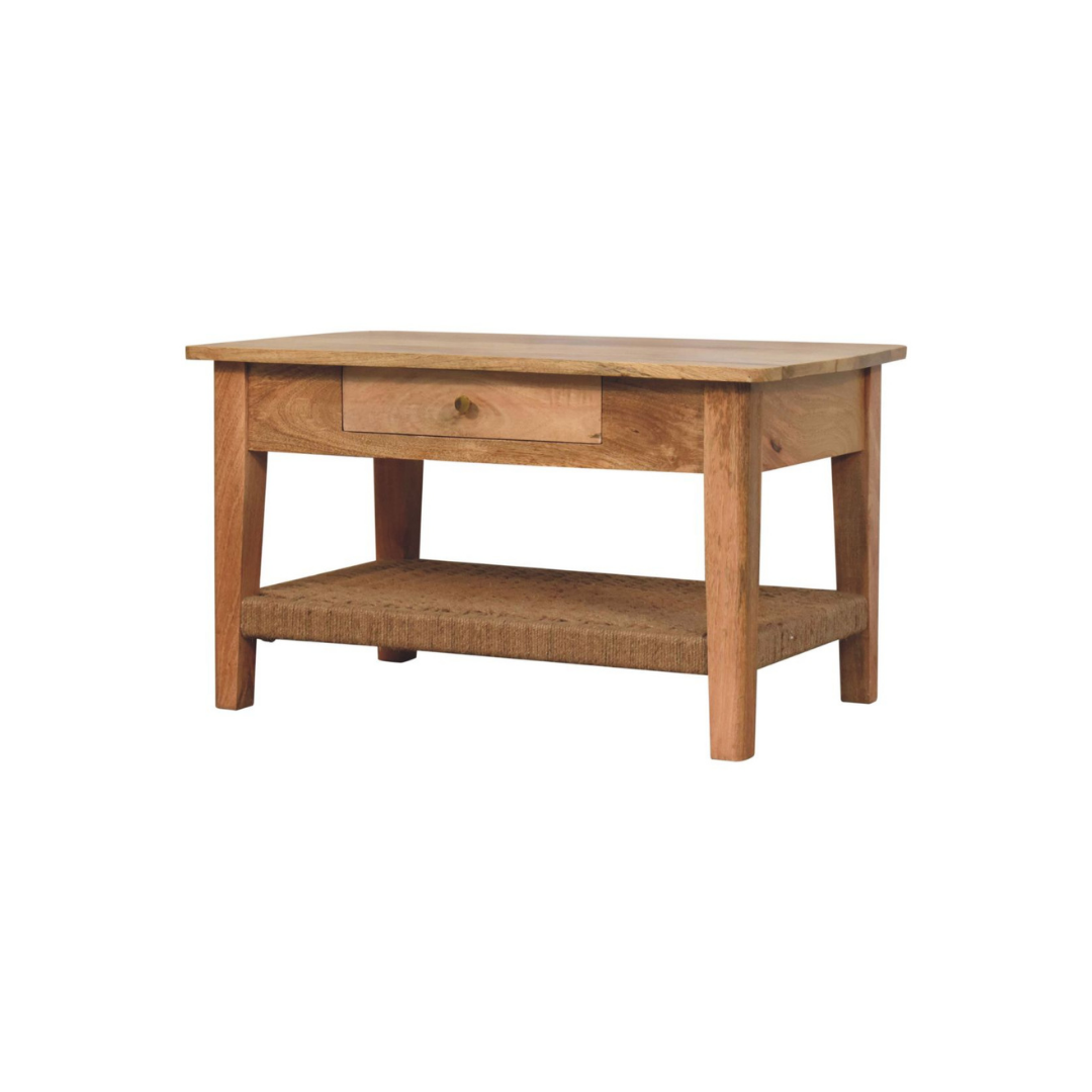 Crafted from 100% solid wood with a warm oak finish, this Rope Coffee Table combines durability with timeless style. It features a discreet drawer to neatly store essentials and a rope-woven shelf that adds texture while providing additional storage. Ideal for organising your living space without compromising on design.