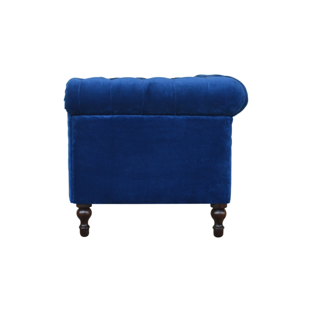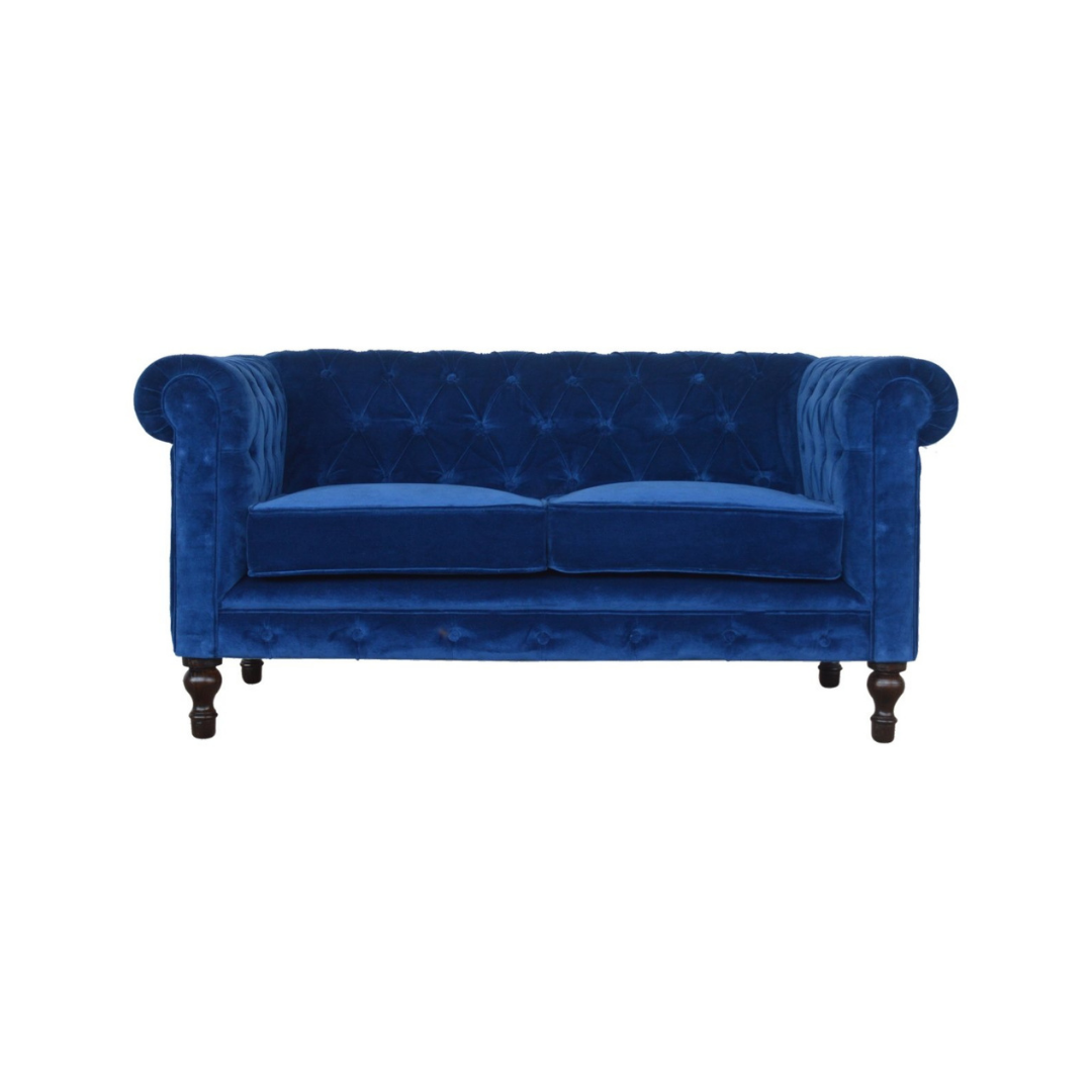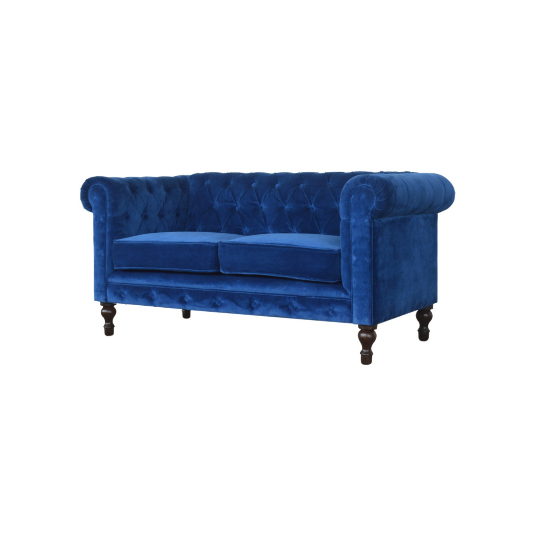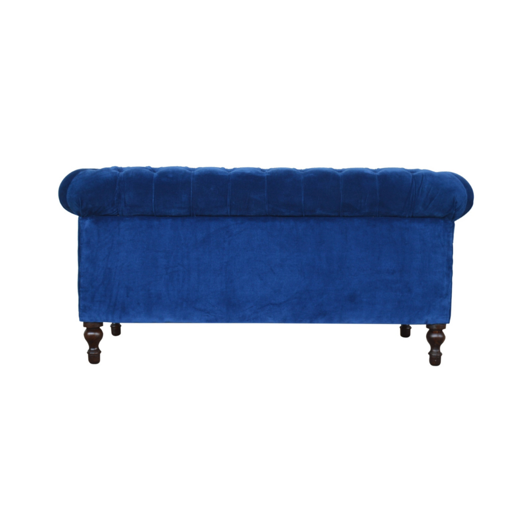 This elegant 2-seater Chesterfield sofa is upholstered in soft royal blue cotton velvet, combining comfort with timeless style. Its deep button tufting, piped edges, and classic shelter arms create a refined silhouette, while the four turned feet crafted from 100% solid mango wood in a walnut finish add durability and warmth. Versatile enough to complement both modern and traditional interiors, this sofa serves as a sophisticated focal point or a subtle accent, enhancing any living space with understated luxury.