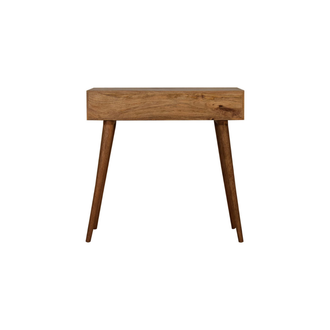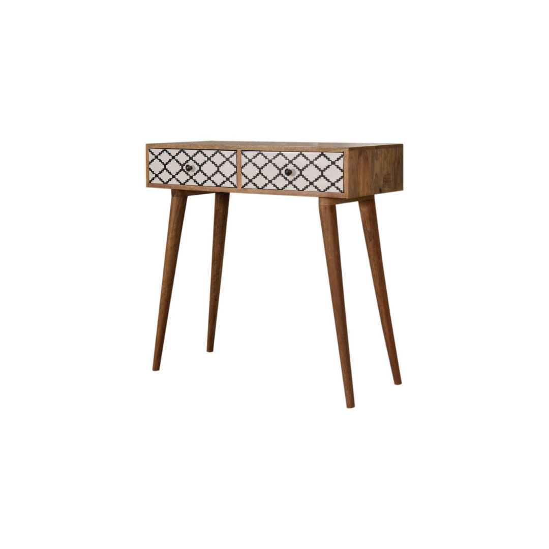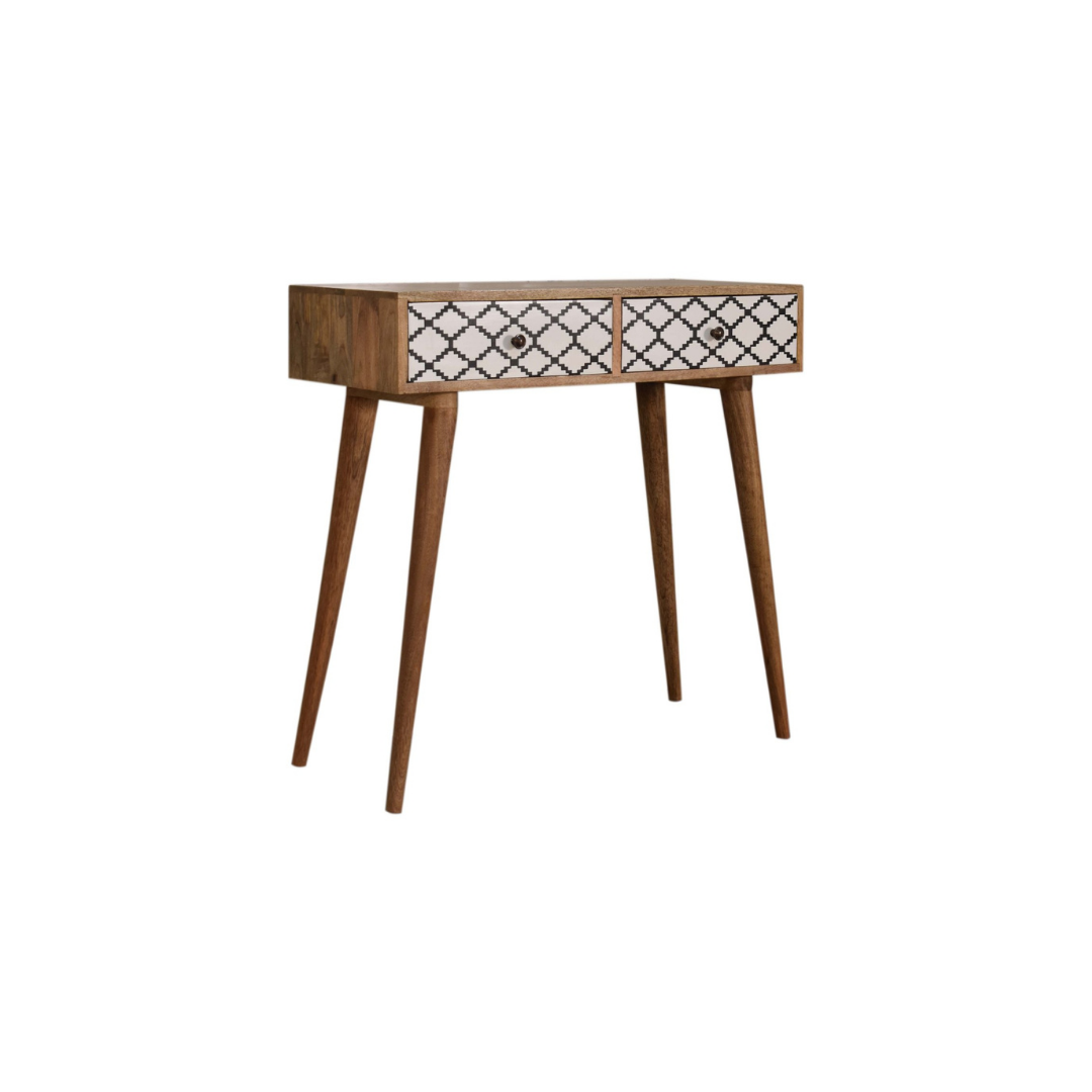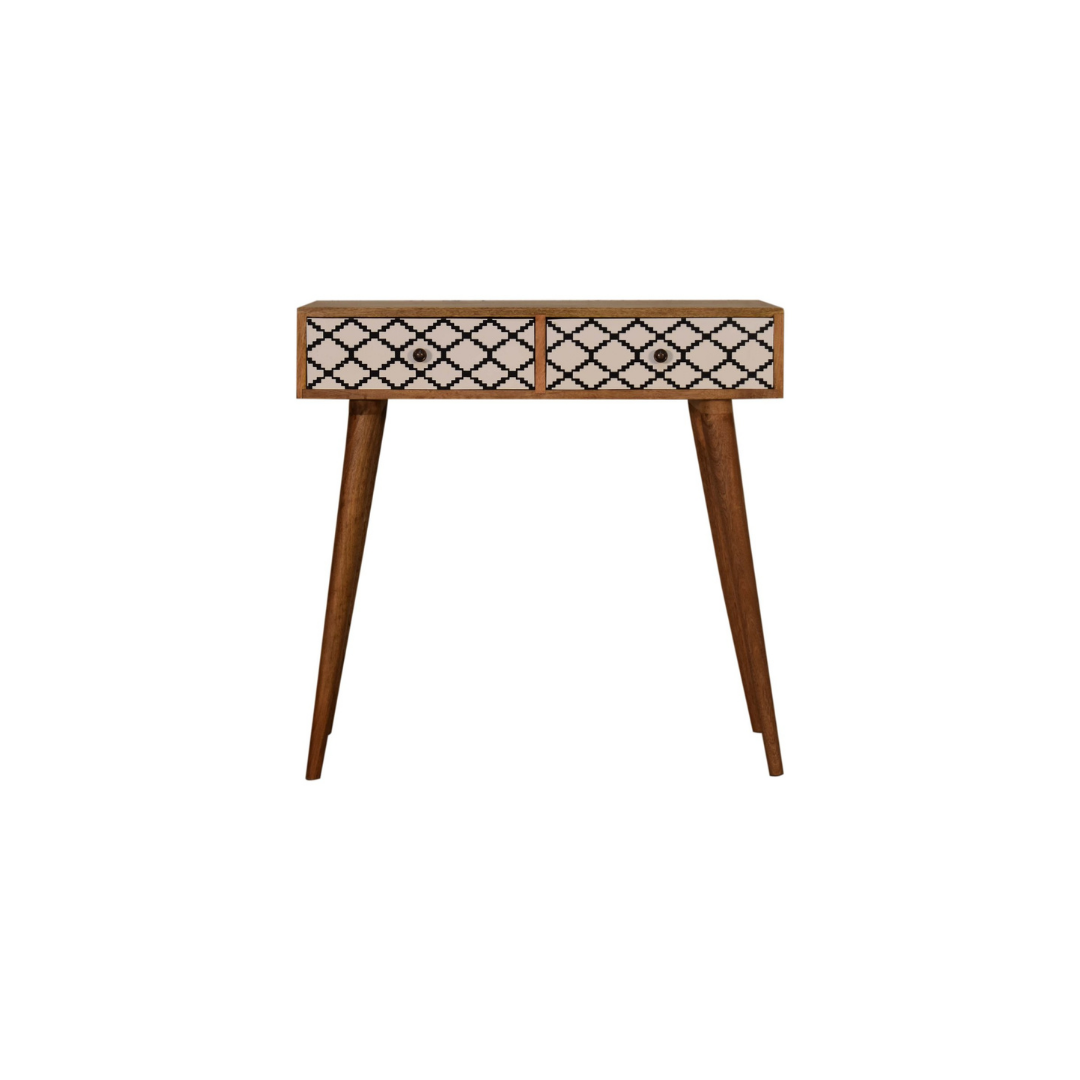 The Stella Console Table is expertly crafted from 100% solid mango wood and finished in a refined oak-inspired tone. Its standout feature is the patterned screen-printed drawer fronts, showcasing a striking black and white design that adds depth and character. With two functional drawers, this piece combines artistic detail with practical storage, making it a sophisticated addition to any space.