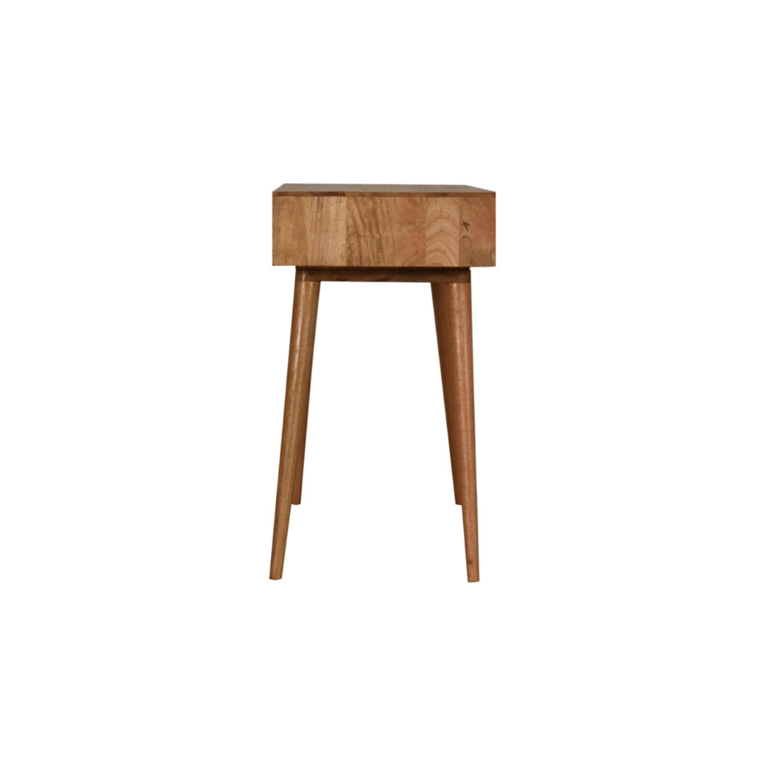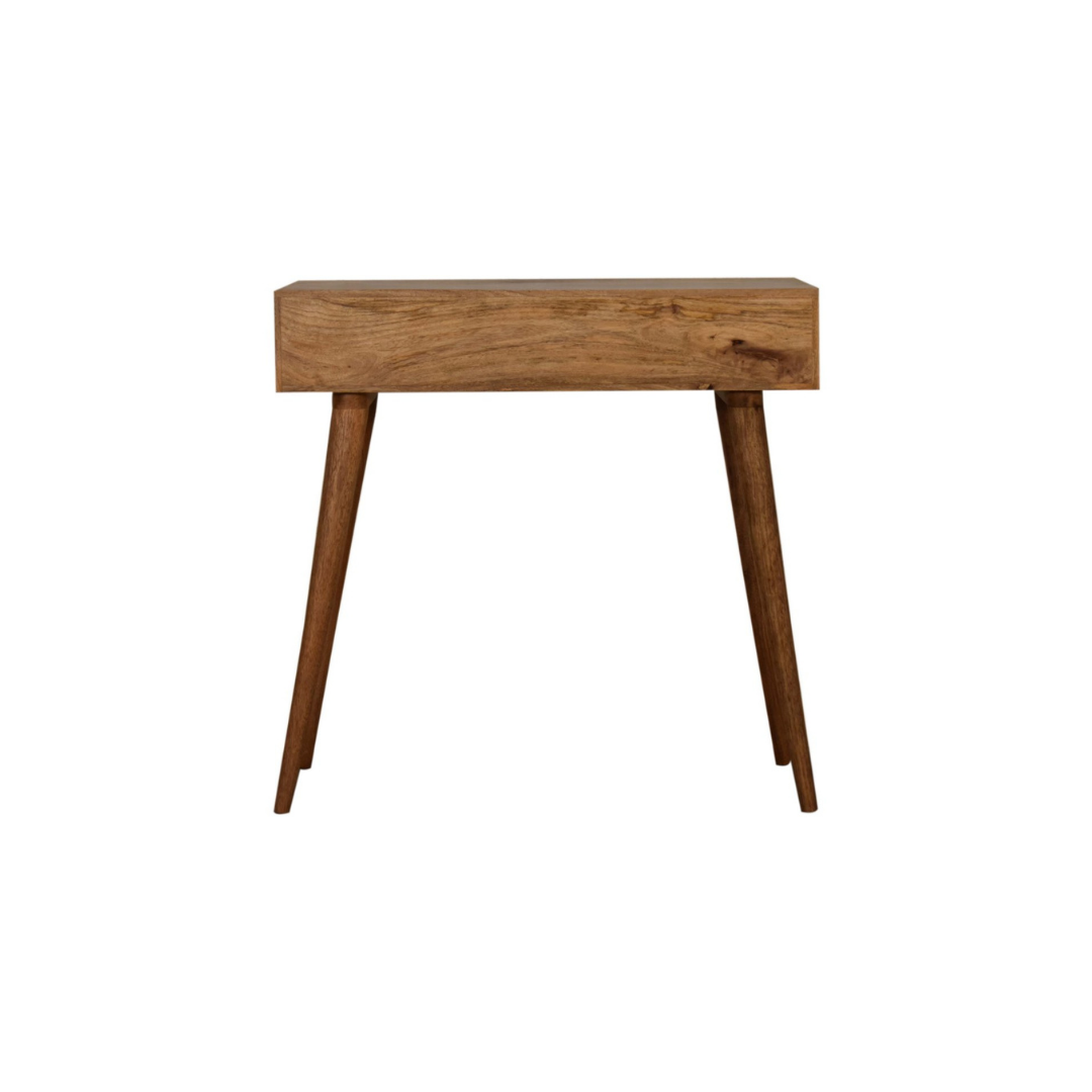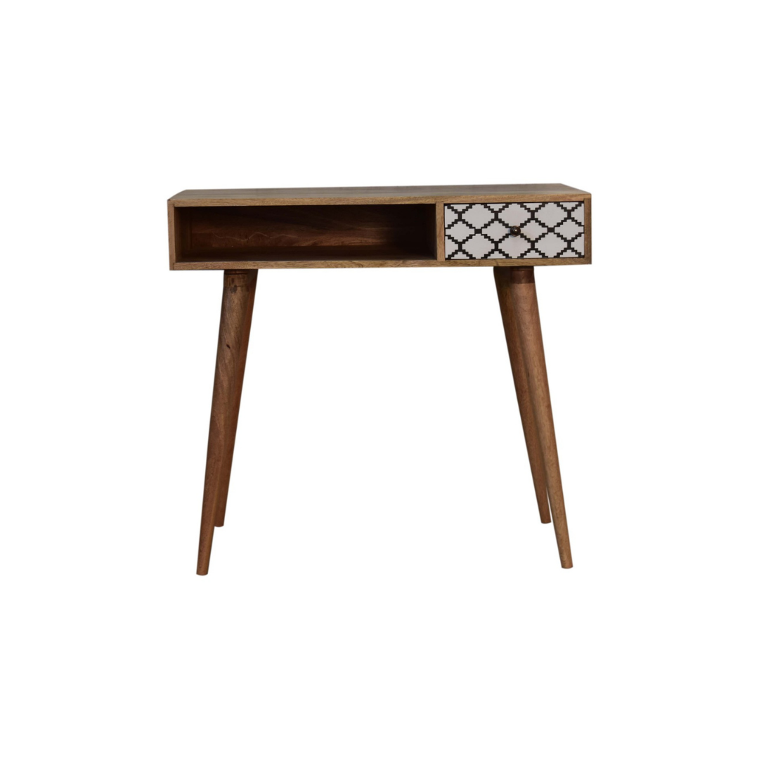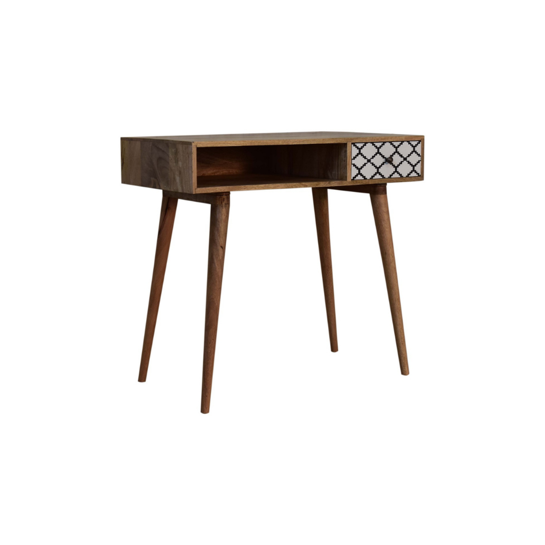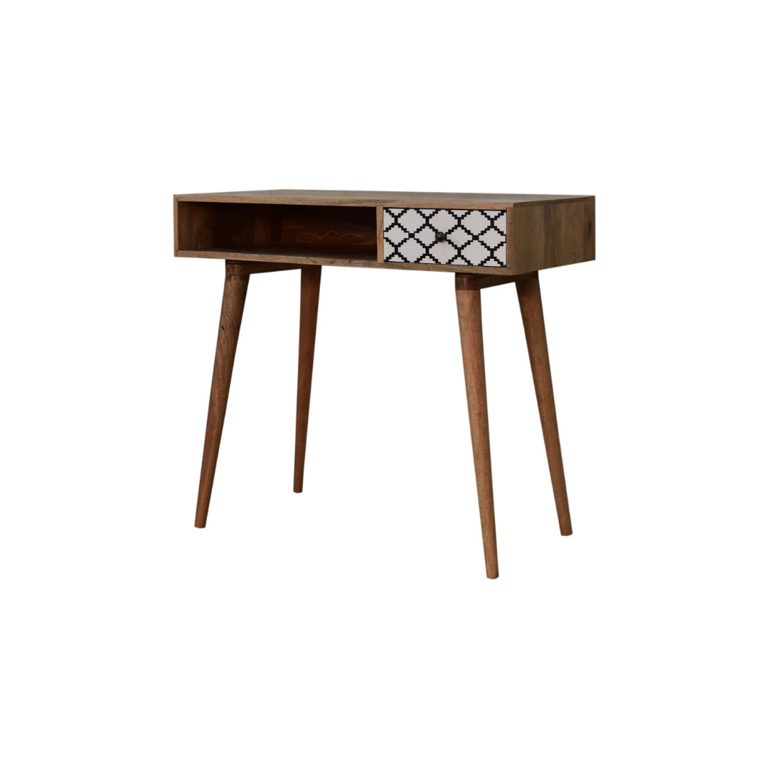 The Stella Writing Desk is expertly crafted from 100% solid mango wood with a refined oak-like finish. Its standout feature is the screen-printed drawer, showcasing a striking black and white geometric pattern that adds depth and character. Designed with four Nordic-style legs, a spacious open slot, and a generous tabletop, this desk provides an elegant and functional workspace ideal for studying or writing.