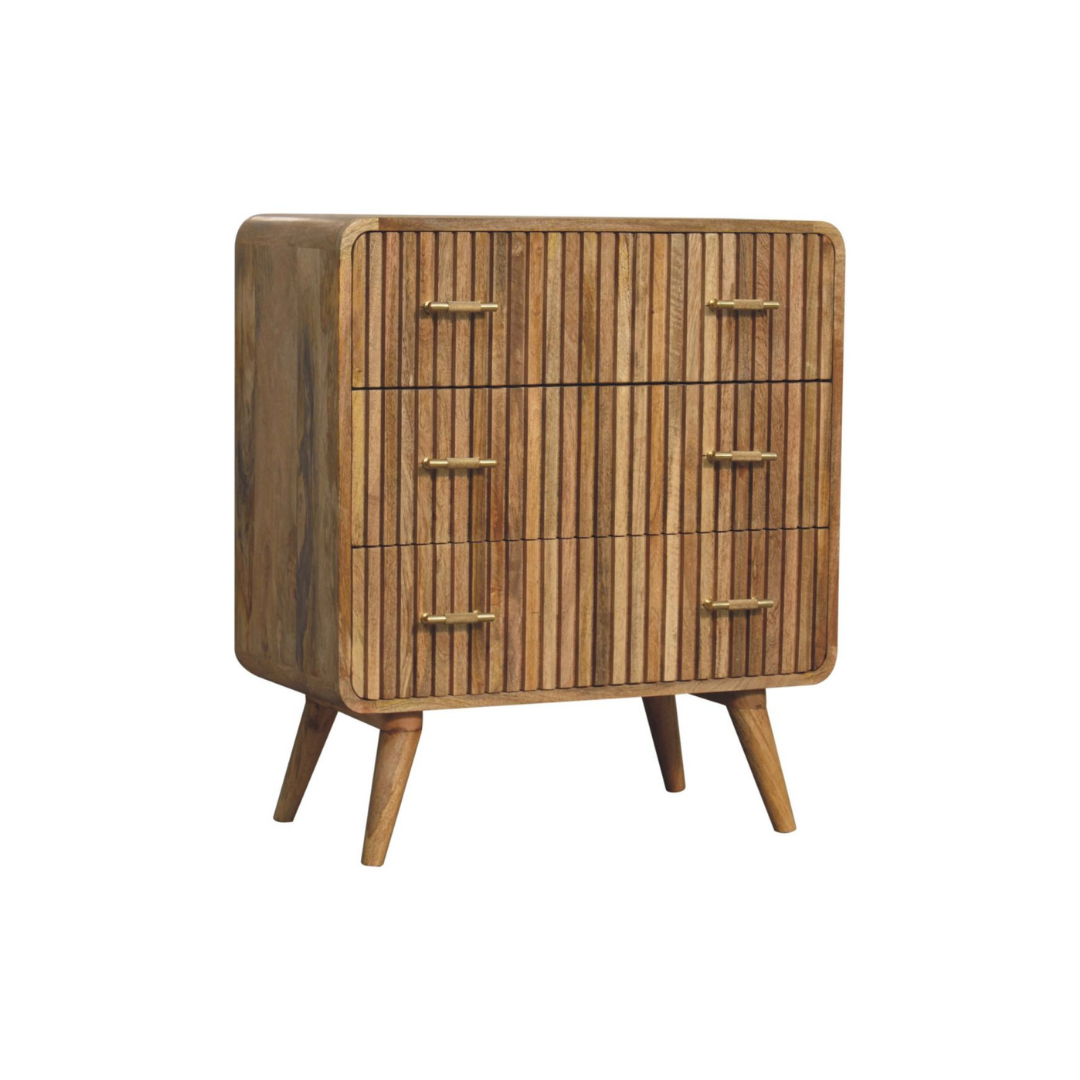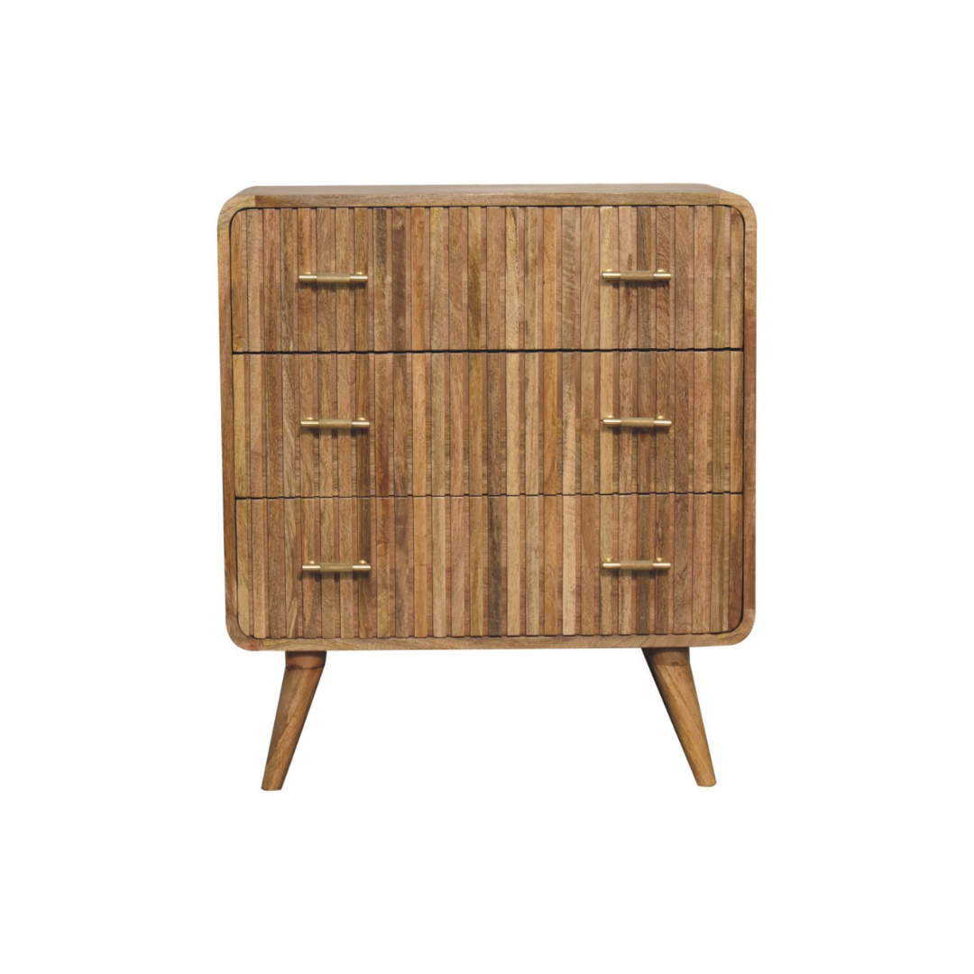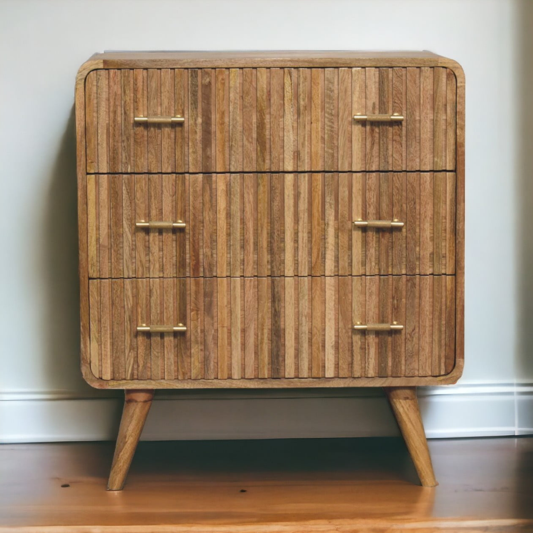 Crafted from 100% solid mango wood with a natural oak-ish finish, this T-bar Ridged Chest offers easy access to its drawers with t-bar handles. With 4 Nordic style legs for stability and a modern touch, it's the perfect storage solution with a blend of style and functionality.