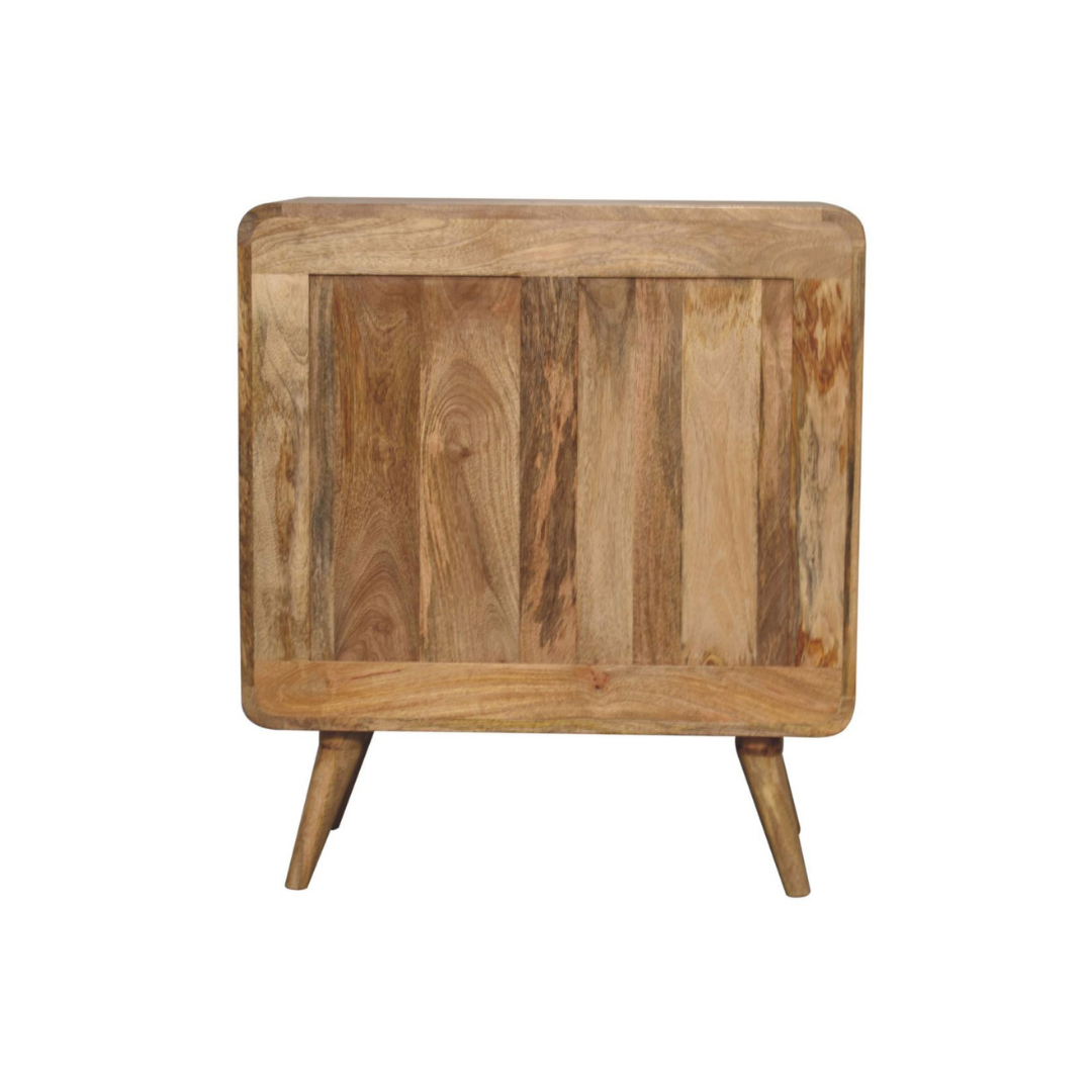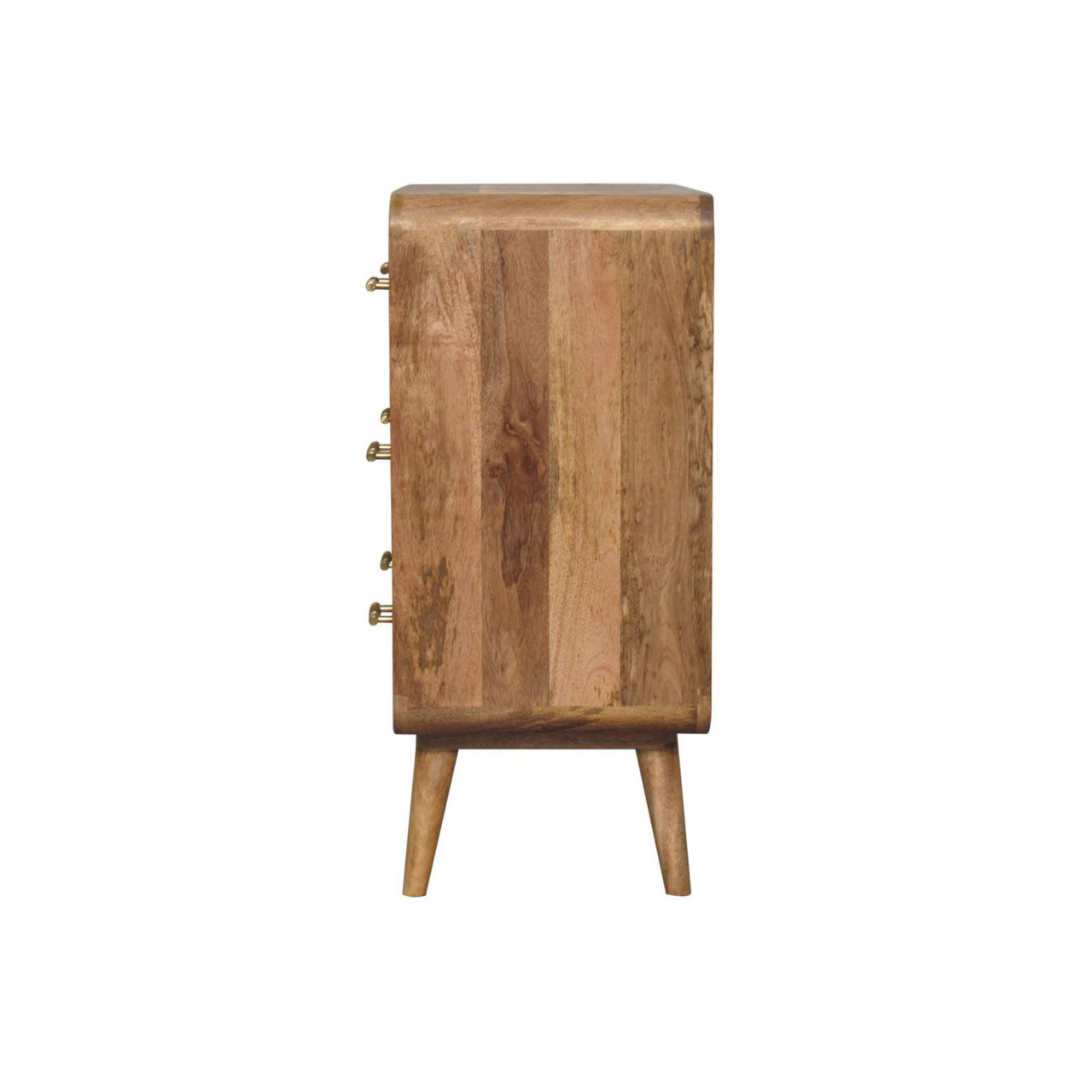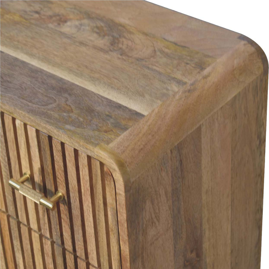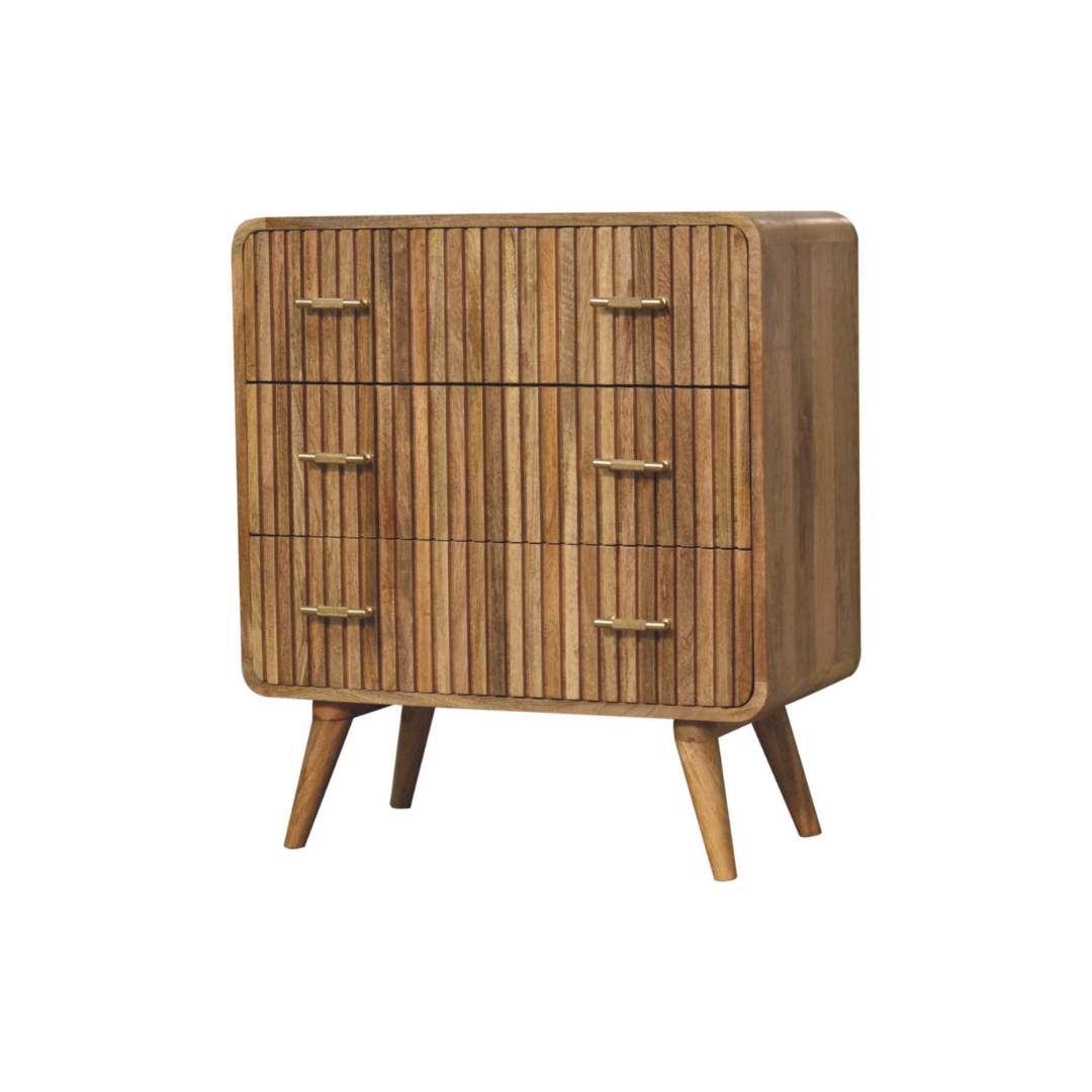 Crafted from 100% solid mango wood with a natural oak-ish finish, this T-bar Ridged Chest offers easy access to its drawers with t-bar handles. With 4 Nordic style legs for stability and a modern touch, it's the perfect storage solution with a blend of style and functionality.
