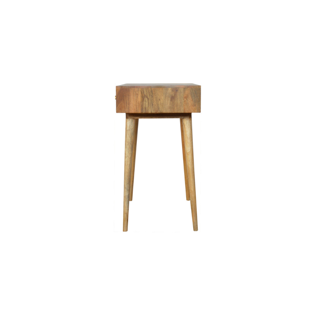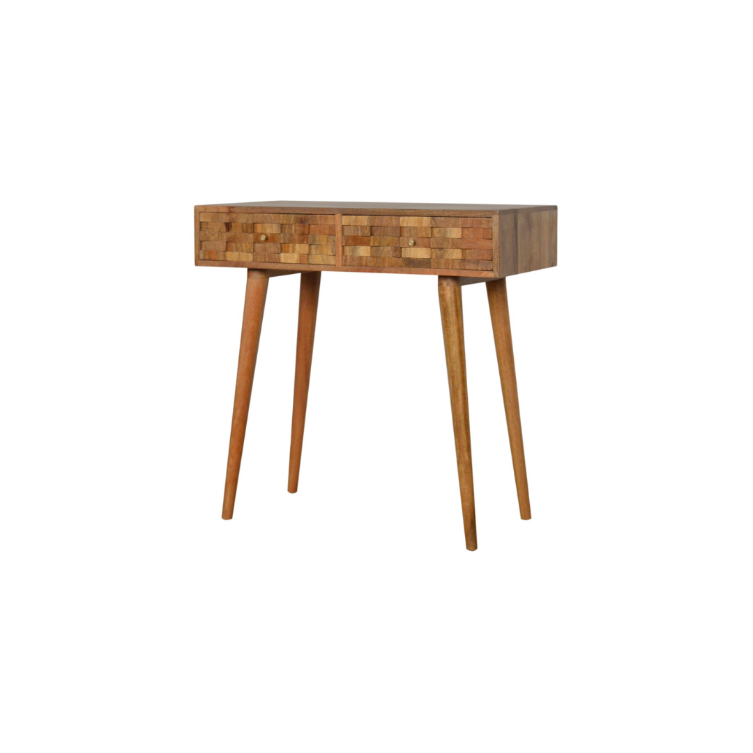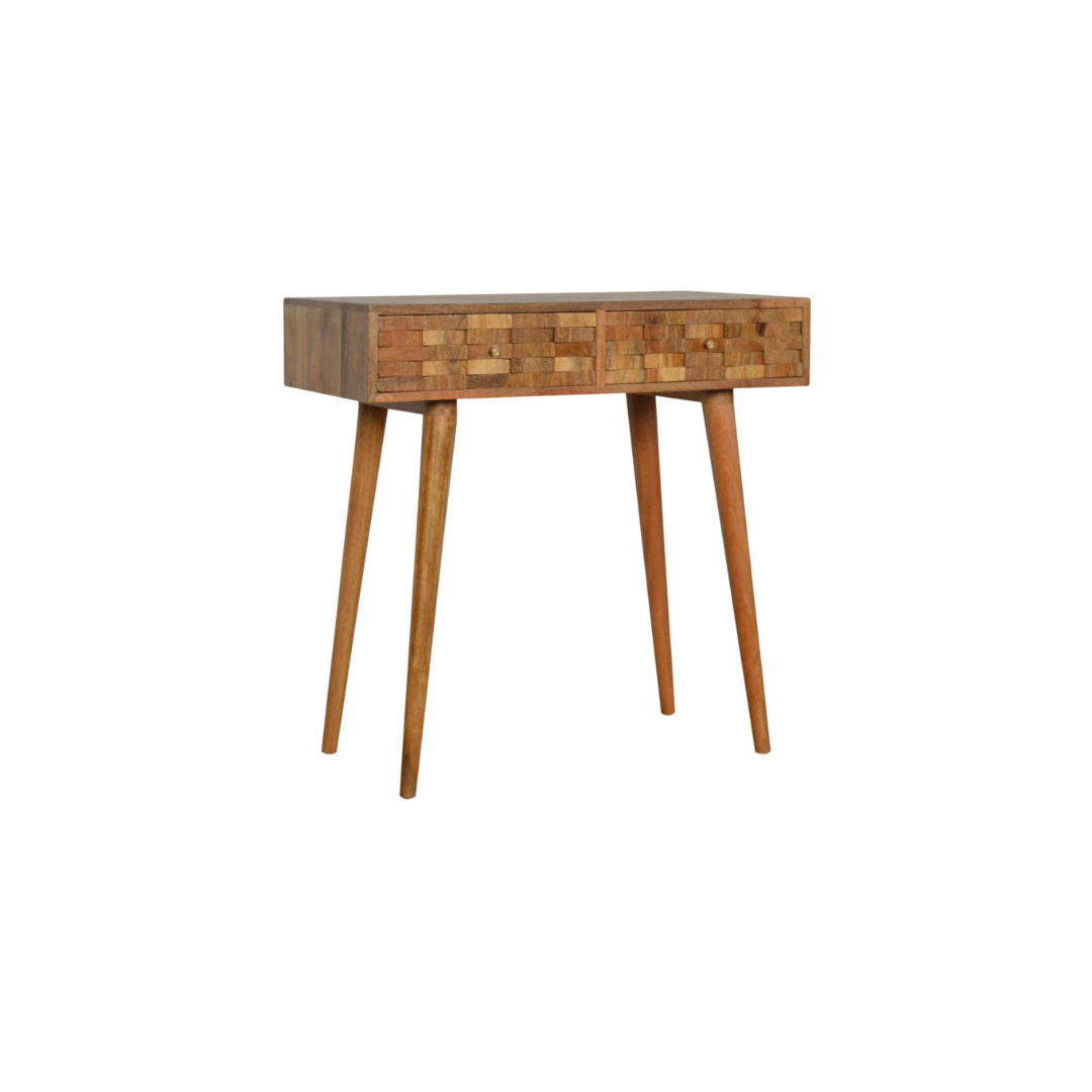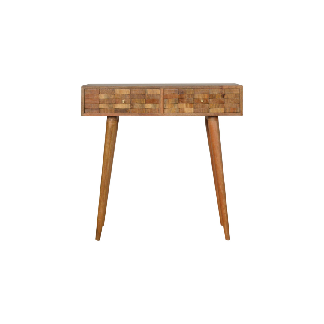 Crafted from 100% solid mango wood with an oak-inspired finish, this Tile Carved Console Table combines durability with refined aesthetics. Its Nordic-style legs provide a sleek, minimalist silhouette, while two spacious drawers with polished candle knobs offer practical storage. Ideal for adding both function and subtle elegance to any hallway or living space.