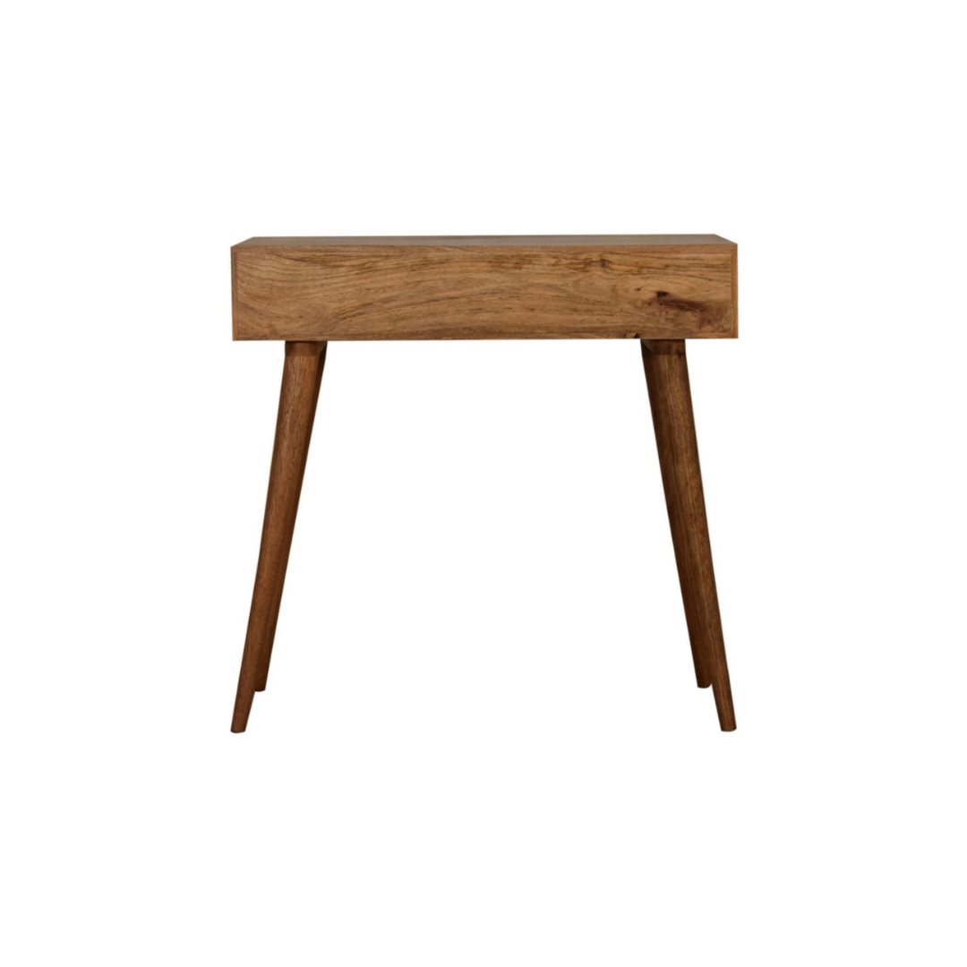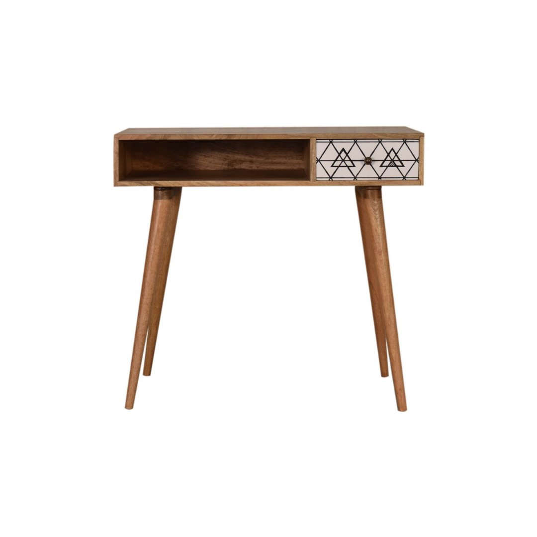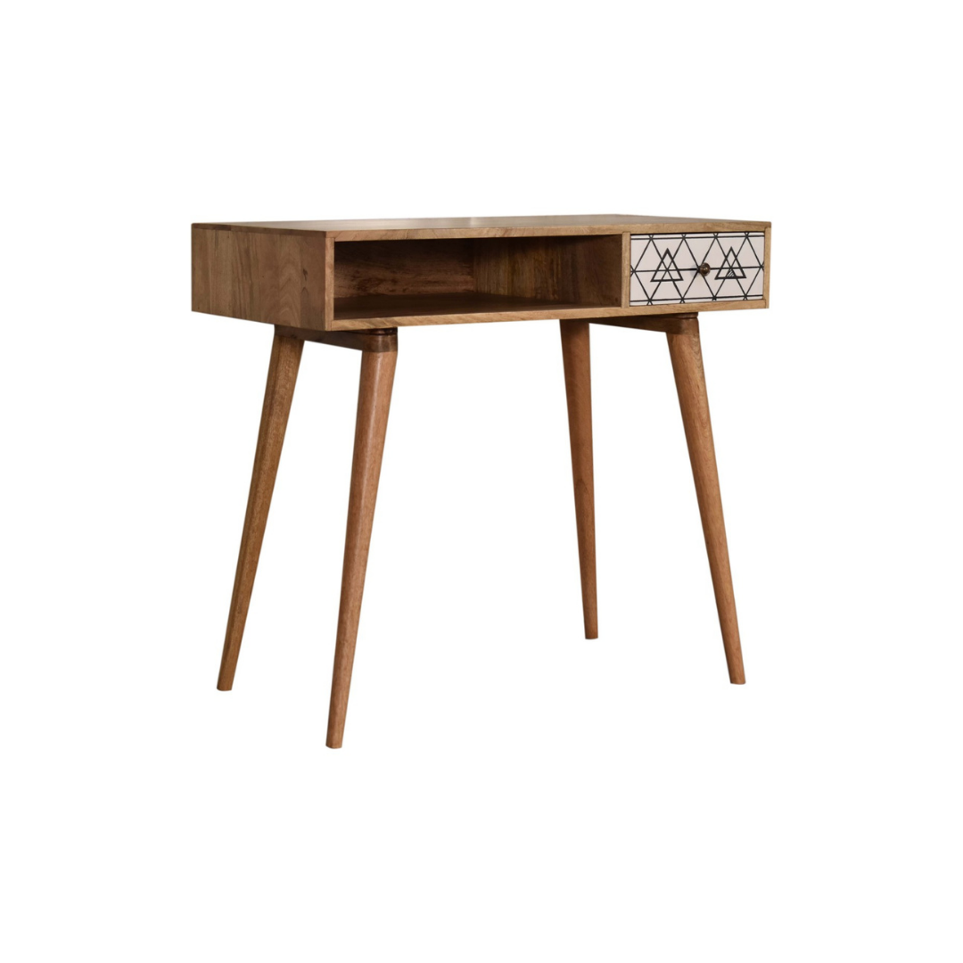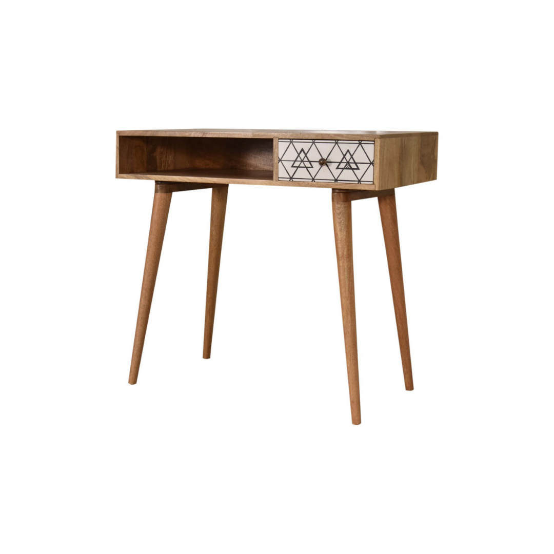 Crafted from 100% solid mango wood with a refined oak-like finish, this writing desk combines durability with elegant design. Its standout feature is the triangle screen-printed drawer, showcasing a striking black and white geometric pattern that adds depth and character. Ideal for both functional workspace and stylish décor, this desk offers a unique blend of craftsmanship and contemporary artistry.