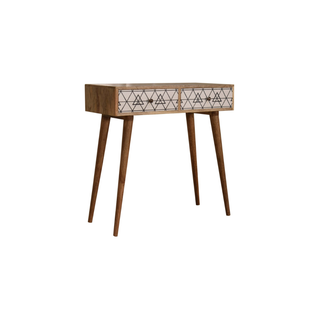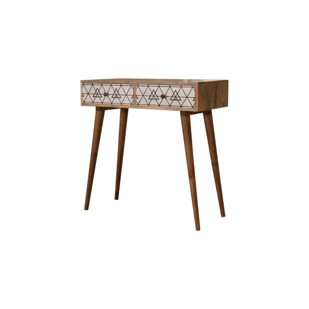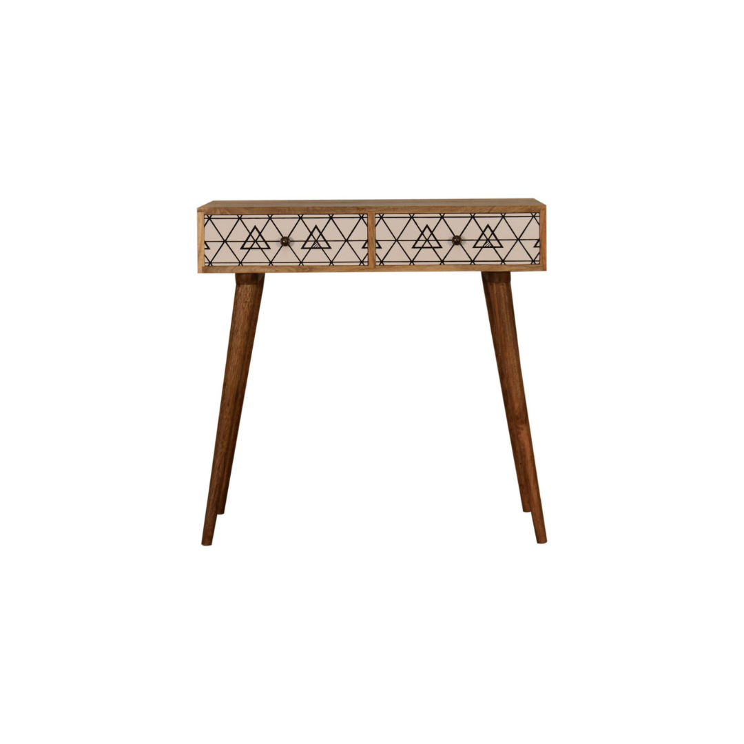 Crafted from 100% solid mango wood with a refined oak-like finish, this two-drawer console table combines durability with style. Its standout feature is the screen-printed black and white geometric design on the drawer fronts, adding depth and visual interest. Supported by four Nordic-style legs, the table offers a sleek, modern silhouette that complements a variety of interiors while providing practical storage.