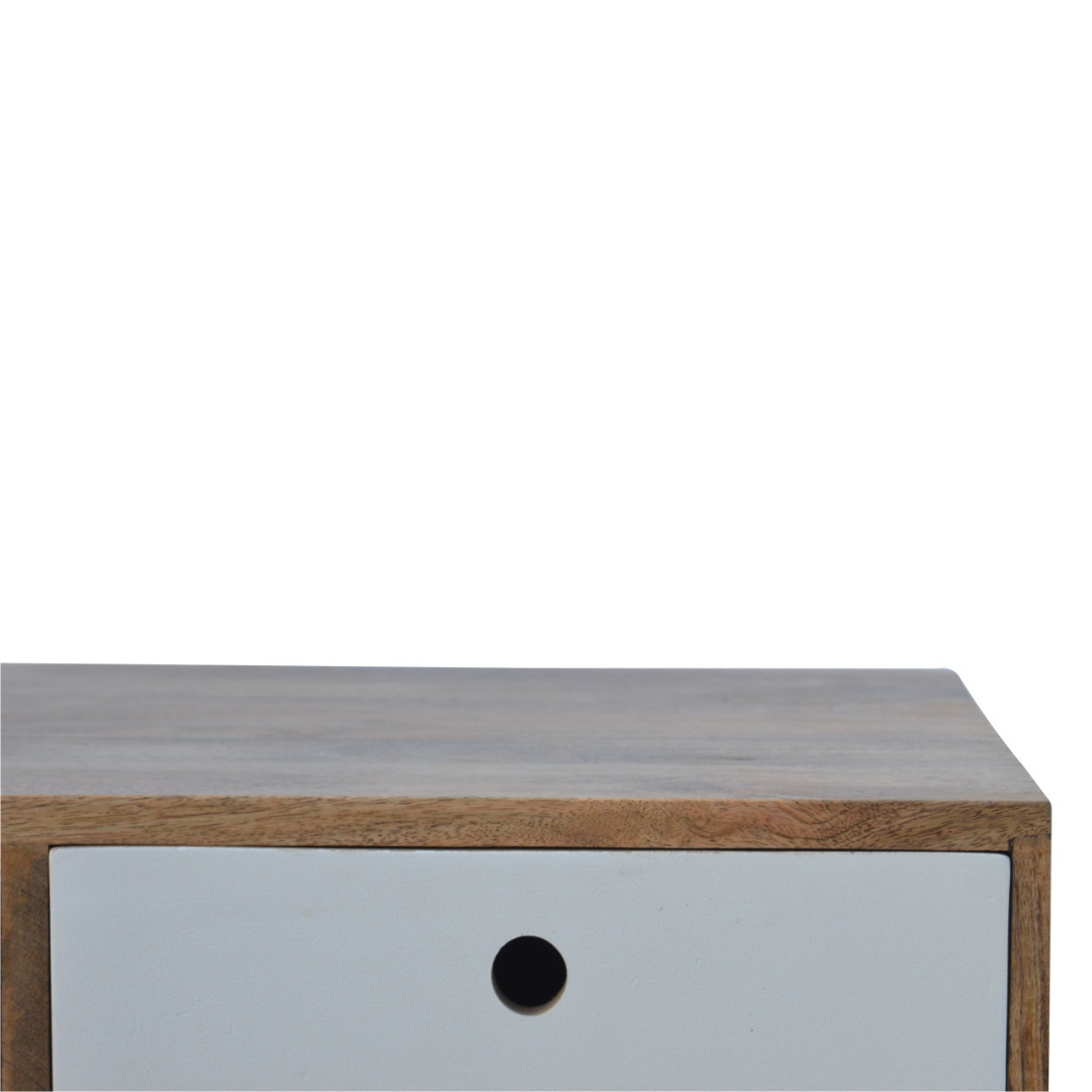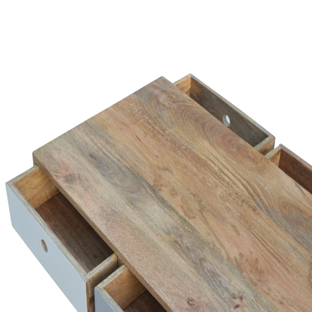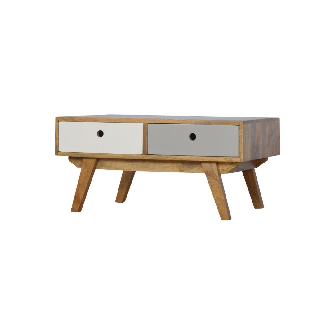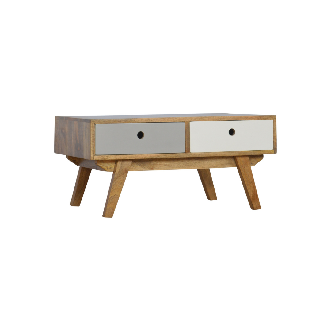 The Two Tone Painted Coffee Table combines functionality and style with its two spacious drawers and open cut-out slots for easy access and storage of living room essentials. Hand-painted in two shades of grey, it features four sturdy Nordic-style legs that provide stability and a timeless look.