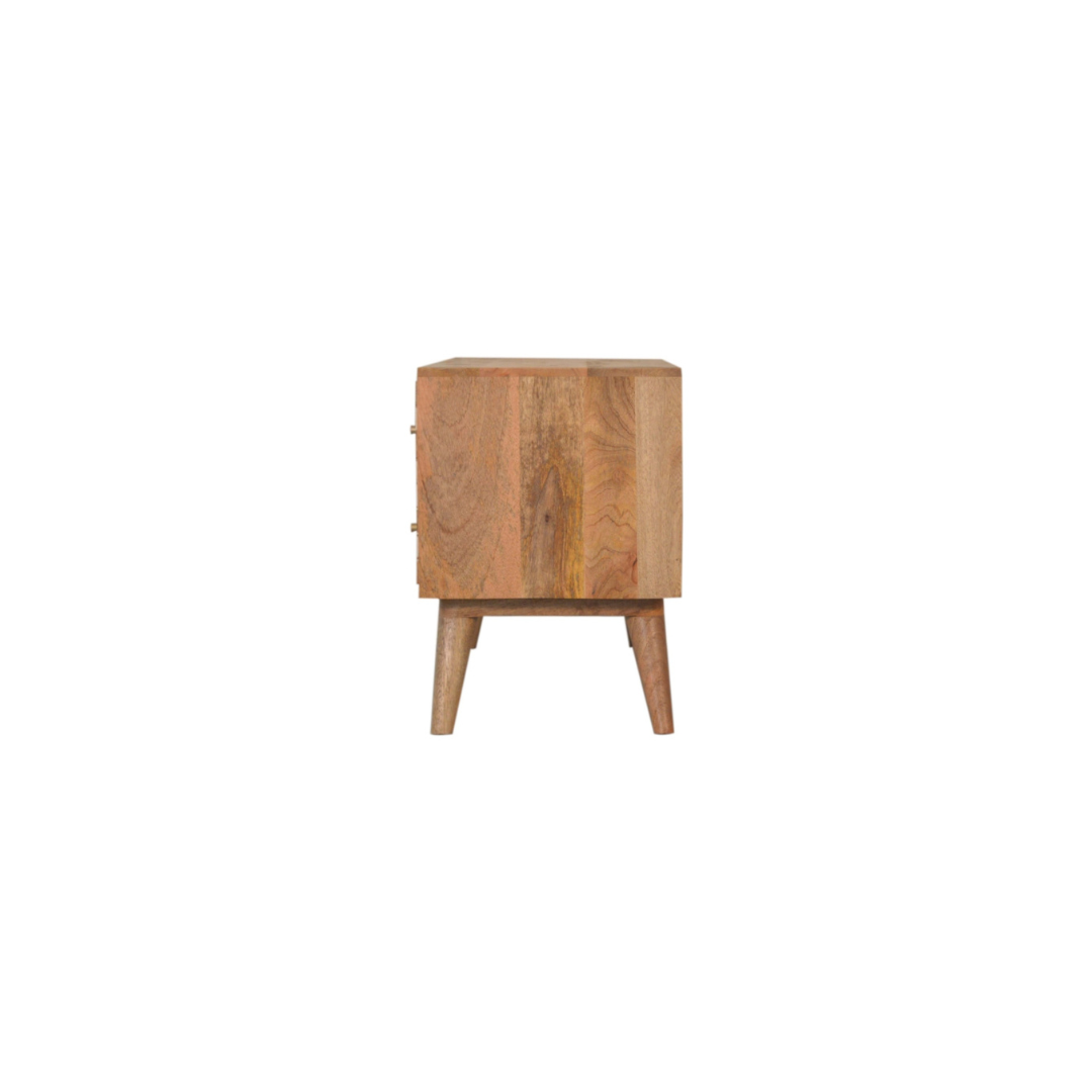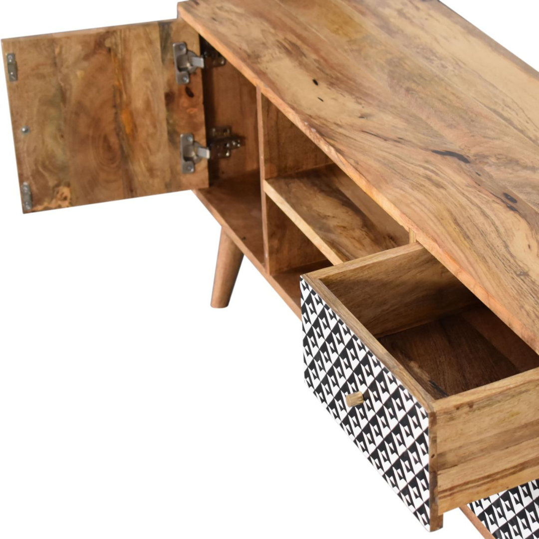 Crafted from 100% solid mango wood with a refined oak-like finish, the Valentina Entertainment Unit combines durability with timeless elegance. Its two doors showcase a distinctive black and white screen-printed pattern, adding a sophisticated visual contrast that enhances any living space.