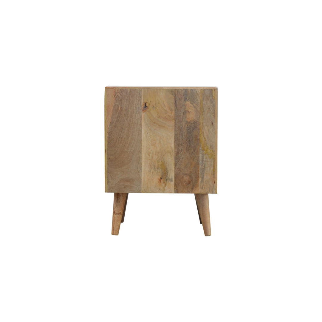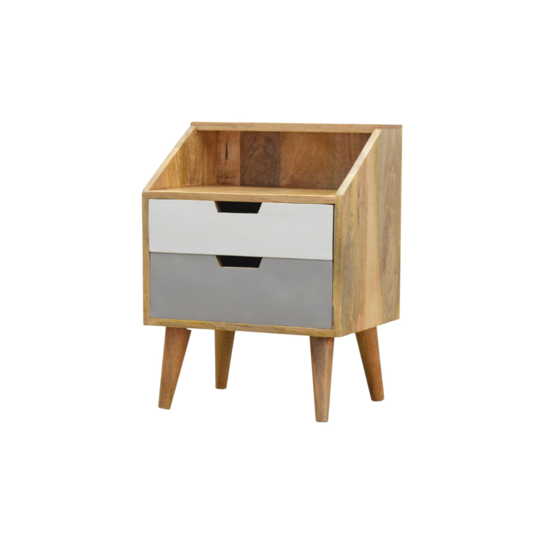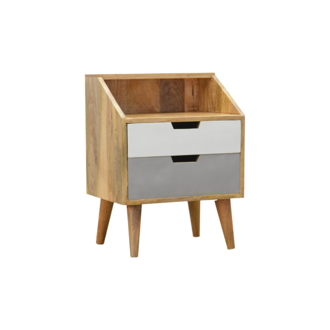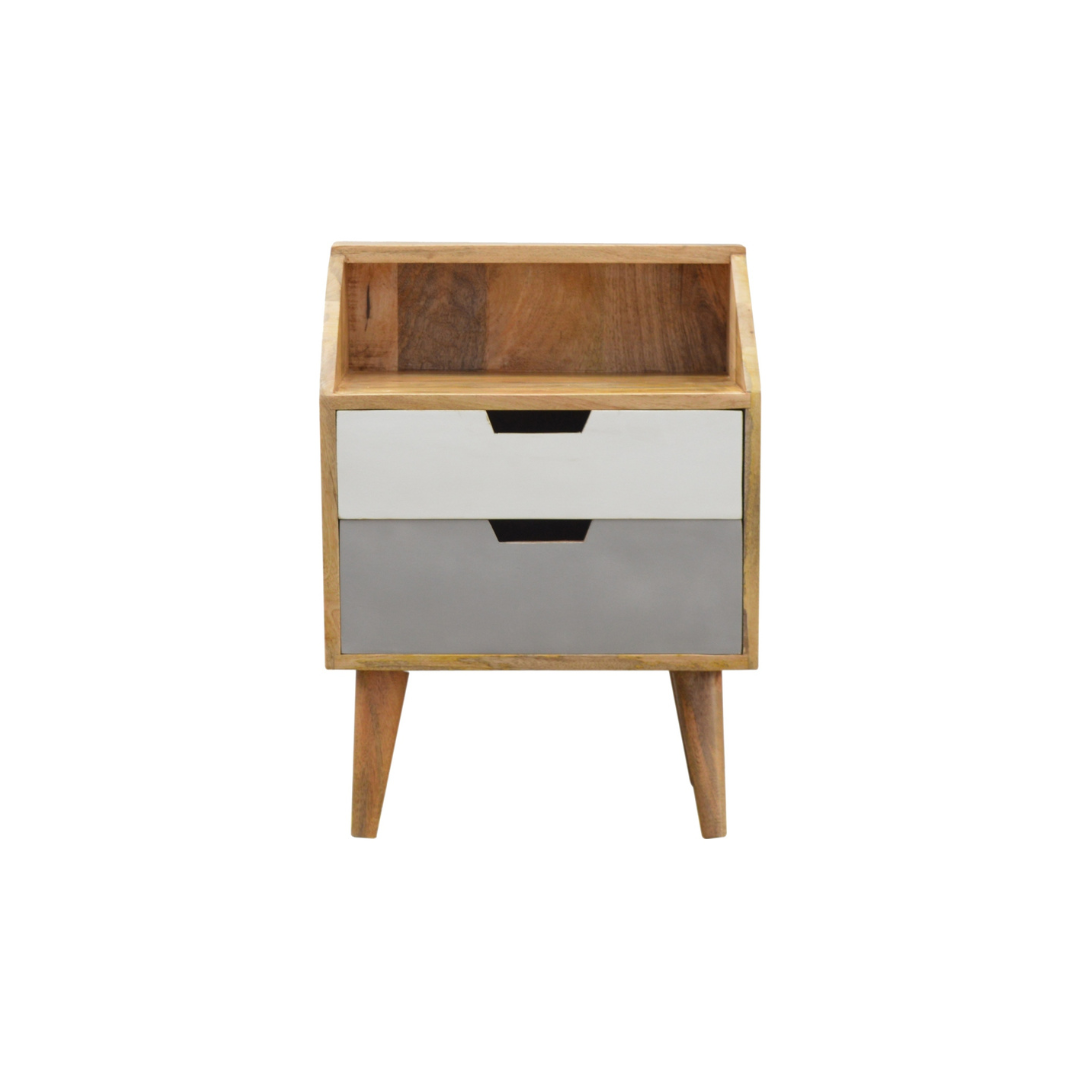 Crafted from 100% solid mango wood with a refined oak-like finish, this bedside table combines durability with elegant design. Its raised open slot offers practical space for a lamp, photo frame, or decorative items, keeping essentials within easy reach. Featuring two hand-painted drawers in grey and white, it provides stylish storage to keep your bedside organised.