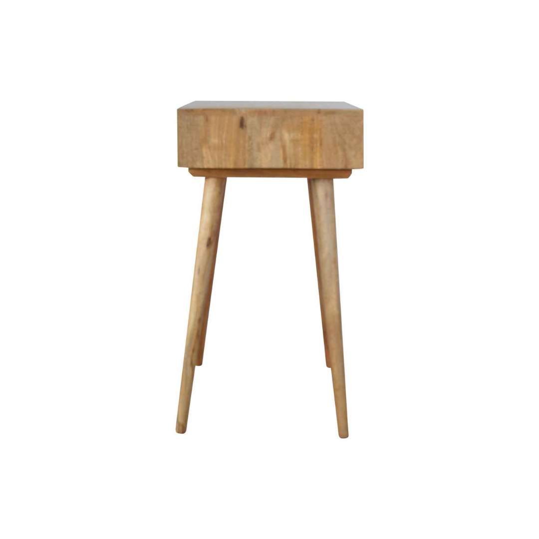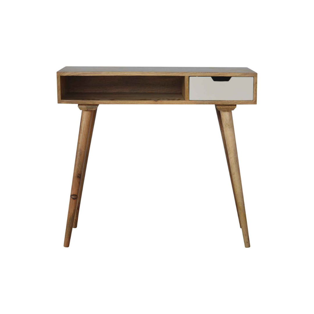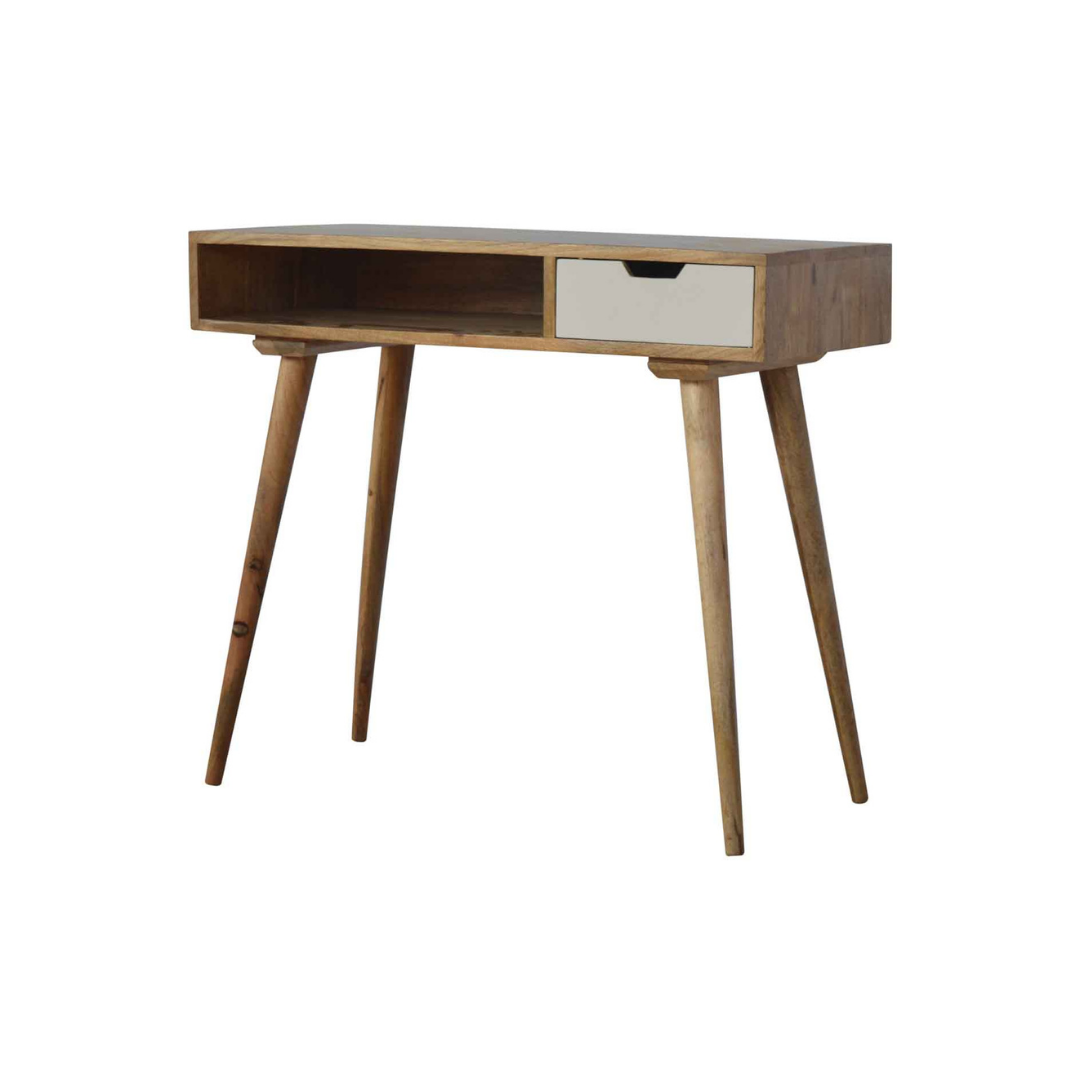 This writing desk, inspired by Nordic painted design, is crafted from 100% solid mango wood with a refined oak-like finish. Its spacious surface offers ample room for work, blending practicality with elegant simplicity. Ideal for creating a clean, organised workspace with a touch of natural warmth.